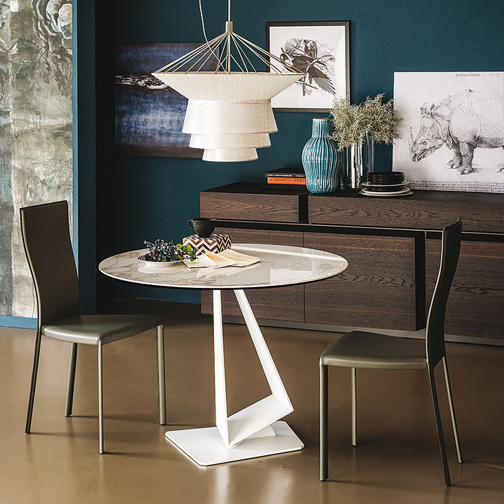 Table with base in graphite (GFM69) or white (GFM71) embossed lacquered steel. Top in Marmi ceramic in Calacatta (KM01), Alabastro (KM02), Ardesia (KM04), Emperador (KM10), Makalu (KM11) or Arenal (KM13).