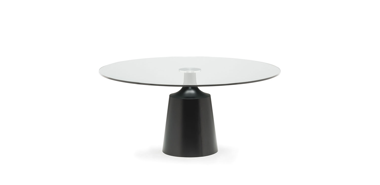 Table with base in graphite (GFM69), white (GFM71), black (GFM73) embossed lacquered steel or satin titanium steel (11). Top with plates in 15mm clear or extra clear glass with bevelled edges. Glazes on the satin titanium base are due to the handmade work.