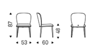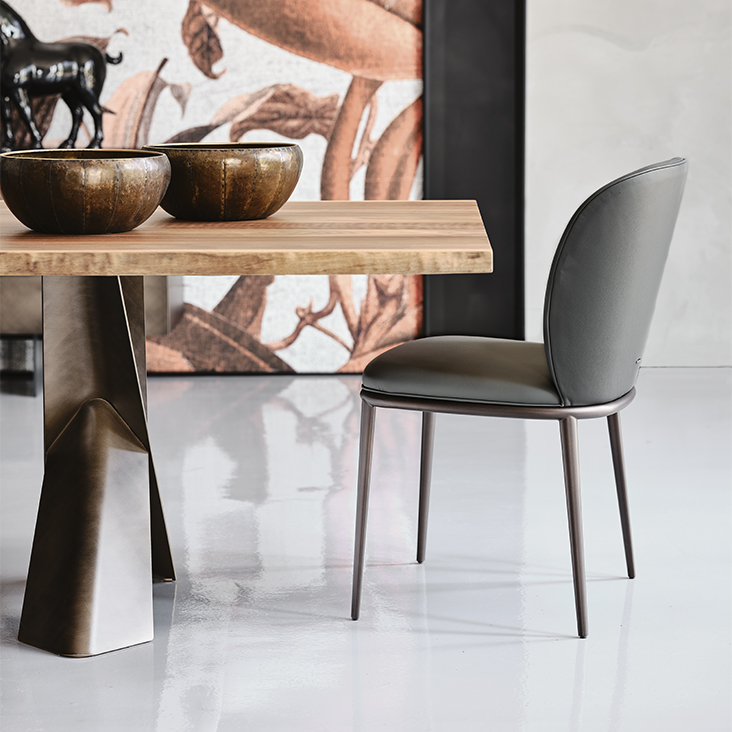 Chair with frame in titanium (GFM11), bronze (GFM18), graphite (GFM69), white (GFM71) or black (GFM73) embossed lacquered steel. Cover in fabric, synthetic nubuck, micro nubuck, soft leather or synthetic leather as per sample card. The cover is not removable.