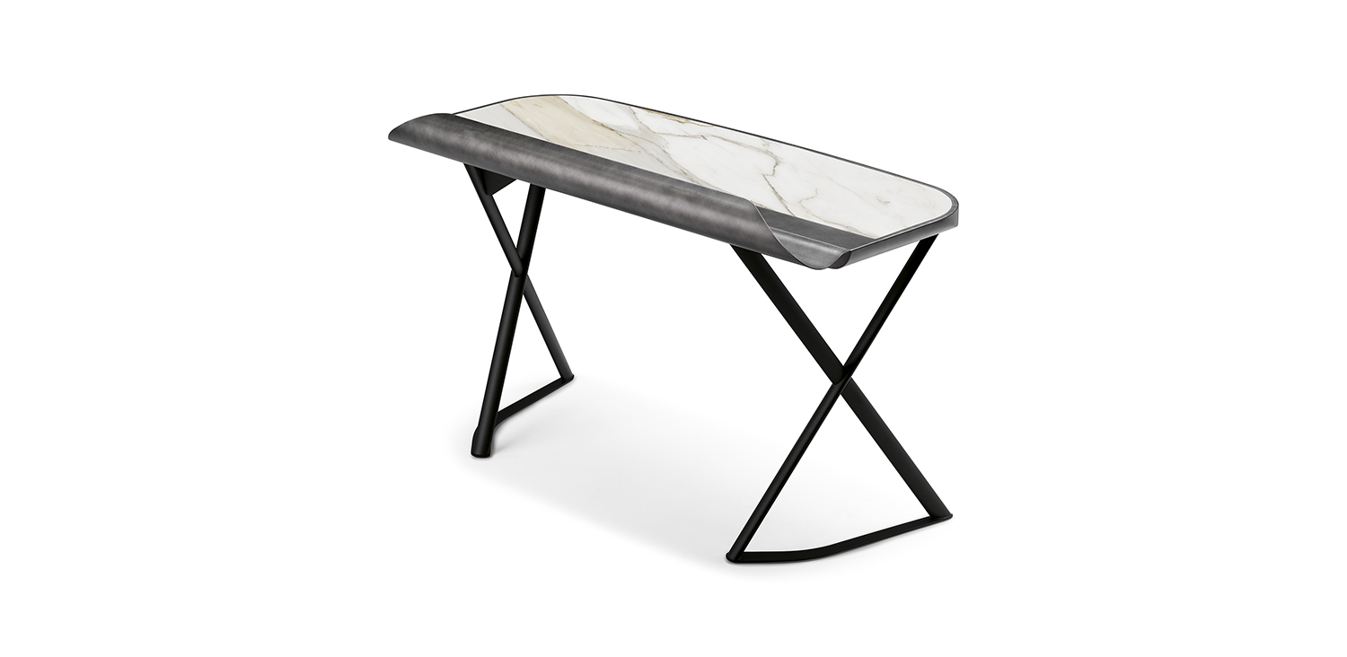 Desk with base in titanium (GFM11), bronze (GFM18) or black (GFM73) embossed lacquered steel. Top in ceramic Marmi Alabastro (KM02), Supreme (KM03), Ardesia (KM04), matt Golden Calacatta (KM05), glossy Golden Calacatta (KM06), matt Portoro (KM07), glossy Portoro (KM08), glossy Sahara Noir (KM09), Emperador (KM10), Makalu (KM11), Breccia (KM12), Arenal (KM13) or Zefiro (KZ20) with Brushed Bronze or Brushed Grey lacquered and rounded lower profile and grooved tray in Brushed Bronze or Brushed Grey lacquered steel.