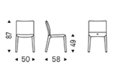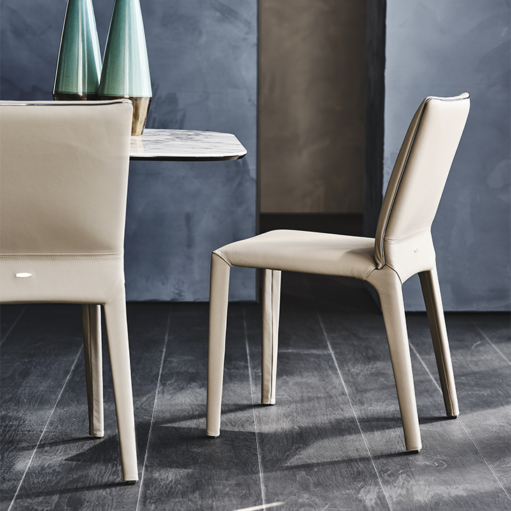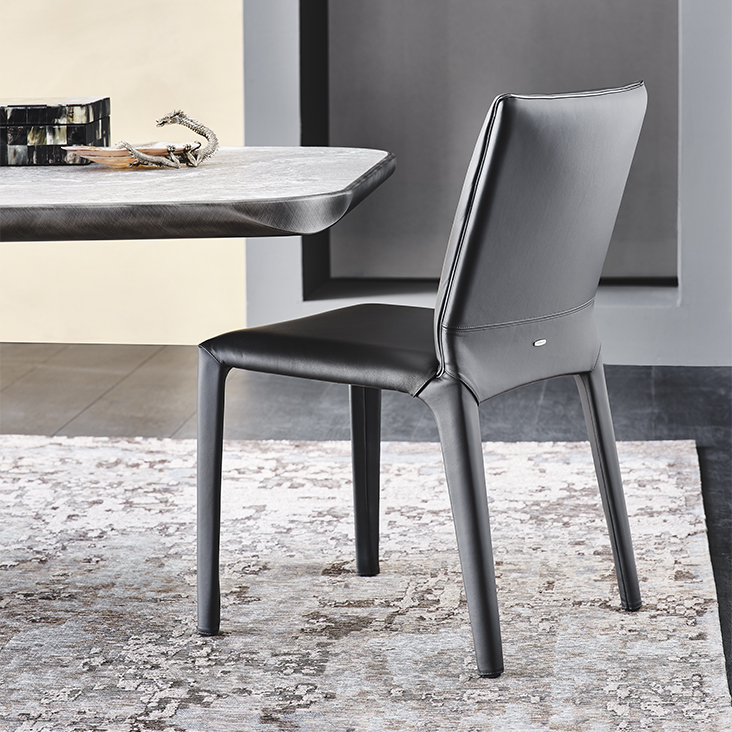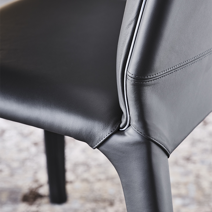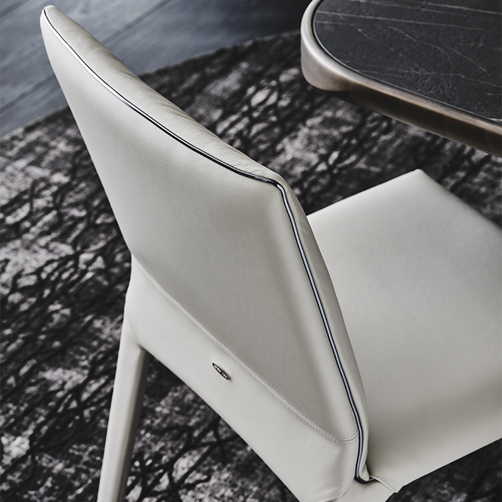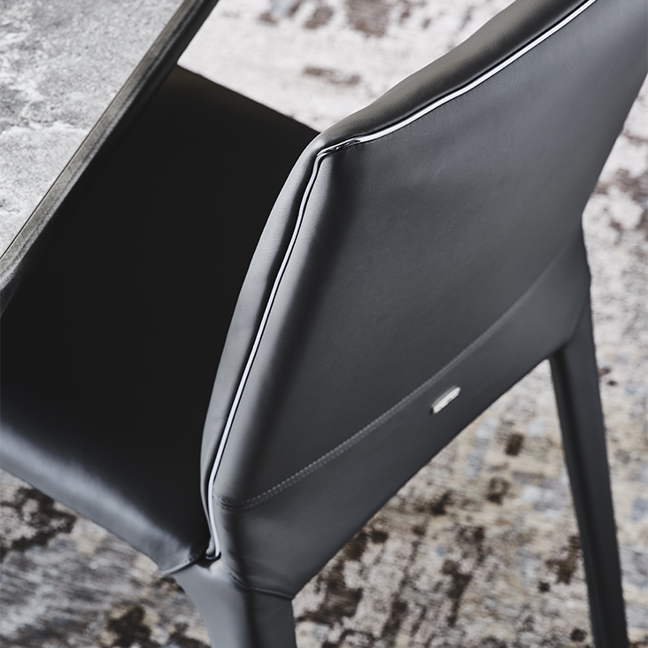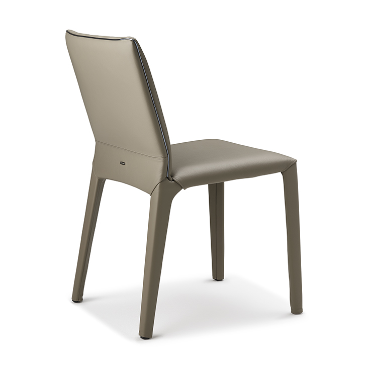 Upholstered chair with steel frame and covered in synthetic leather, fabric, synthetic nubuck, micro nubuck or soft leather as per sample card. Piping gun metal grey color. The cover is not removable.