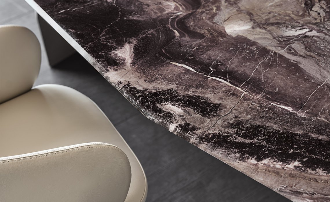 The glass top extends 4 metres in an irregular shape with rounded corners. This modern glass table seems to follow no geometric rules, yet the result is perfectly balanced and harmonious. Every detail, from the shape of the top, to the asymmetrical metal bases, to the decoration of the top, gives the impression of a natural object, a precious stone or a monolith shaped by man to assign it a function.