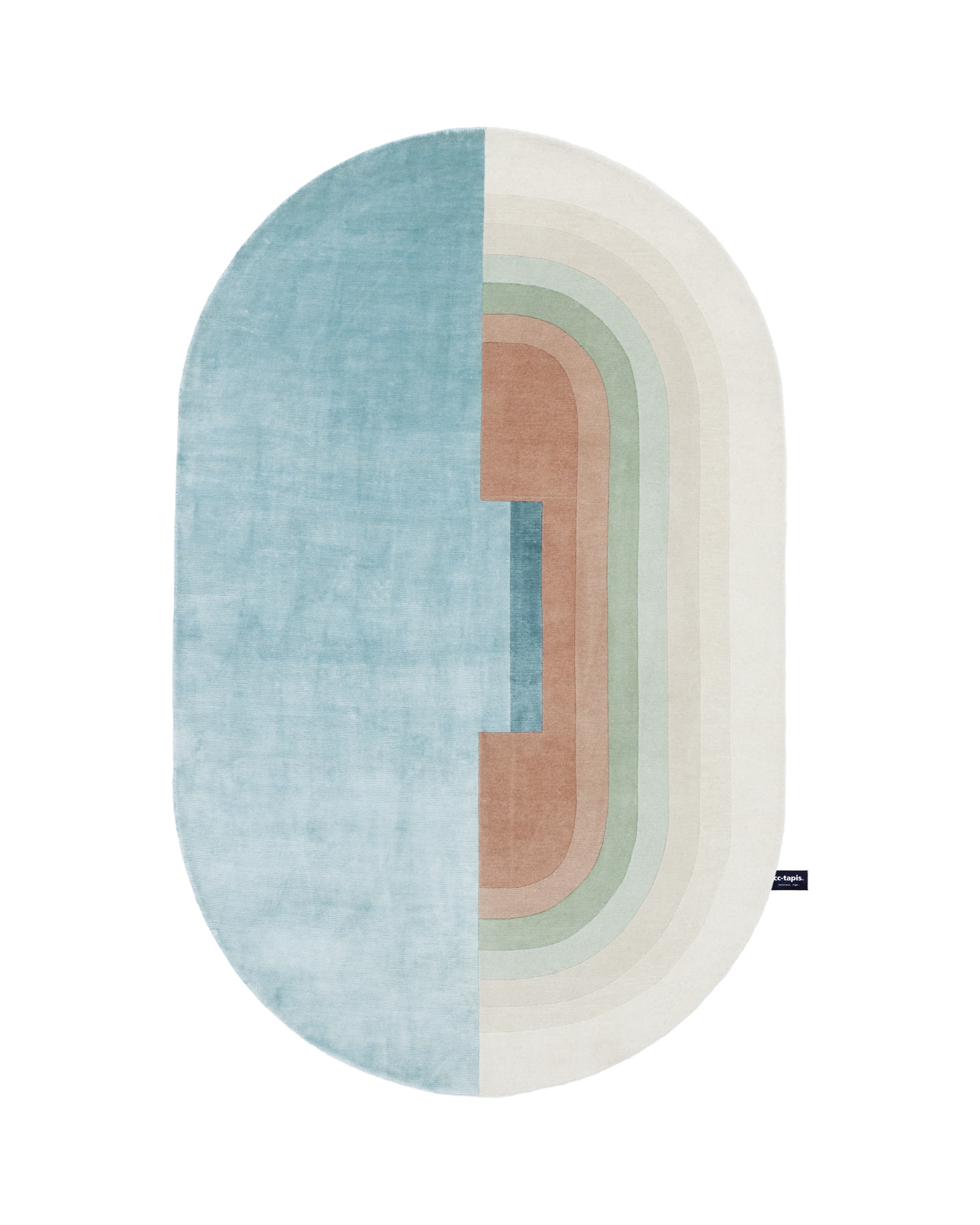 From a photo of a Venetian flight of stairs came the idea to reinterpret the iconic image of steps covered in water by the lagoon through the colors and materials of a rug, Giudecca which is part of the Acqua Alta Collection for Rubelli was created. The different tones of grey of the wool create the stone steps, marked by salt and the effects of time. The sea and the vibrations of the waves are transformed into a shimmering silk surface where tones of blue and green radiate together. Venice and its magical atmosphere are represented into a new contemporary vision through a rug completely knotted by hand in Nepal.
