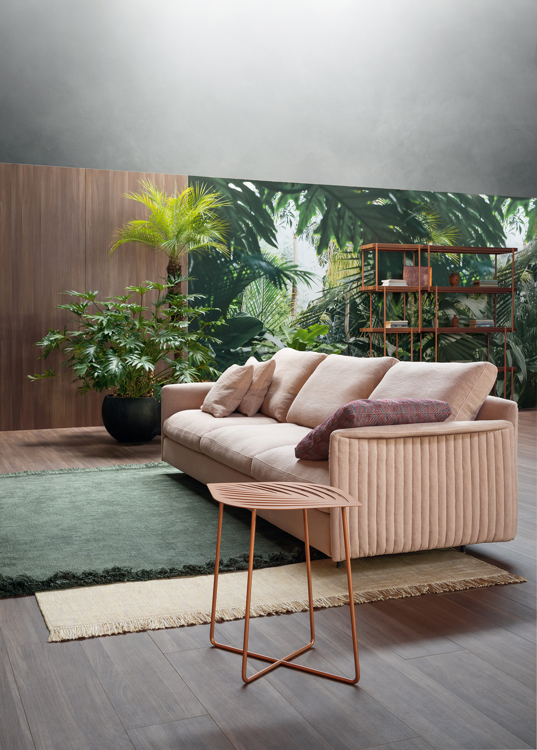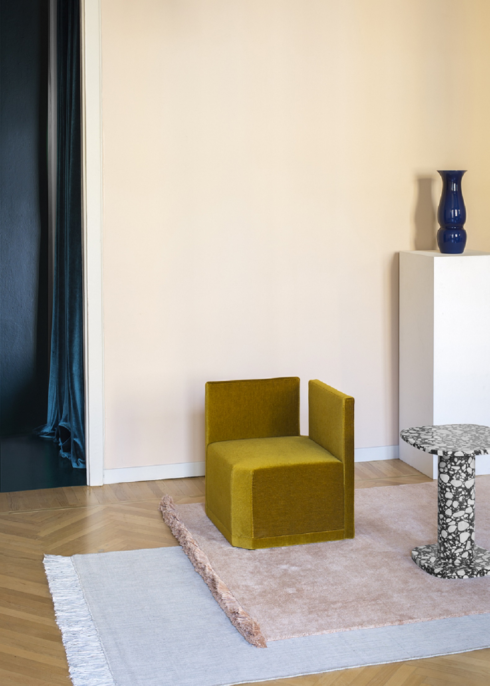 A design which plays with the idea of superimposed layers and which was inspired from a bird’s-eye view of wheat fields, hence the name “Campo”, which in Italian means field. A playful rug that combines a low flatweave, a high-pile and a clever design creating the effect that there are two rugs overlapping, but doesn’t let your eyes deceive you, it is one rug.