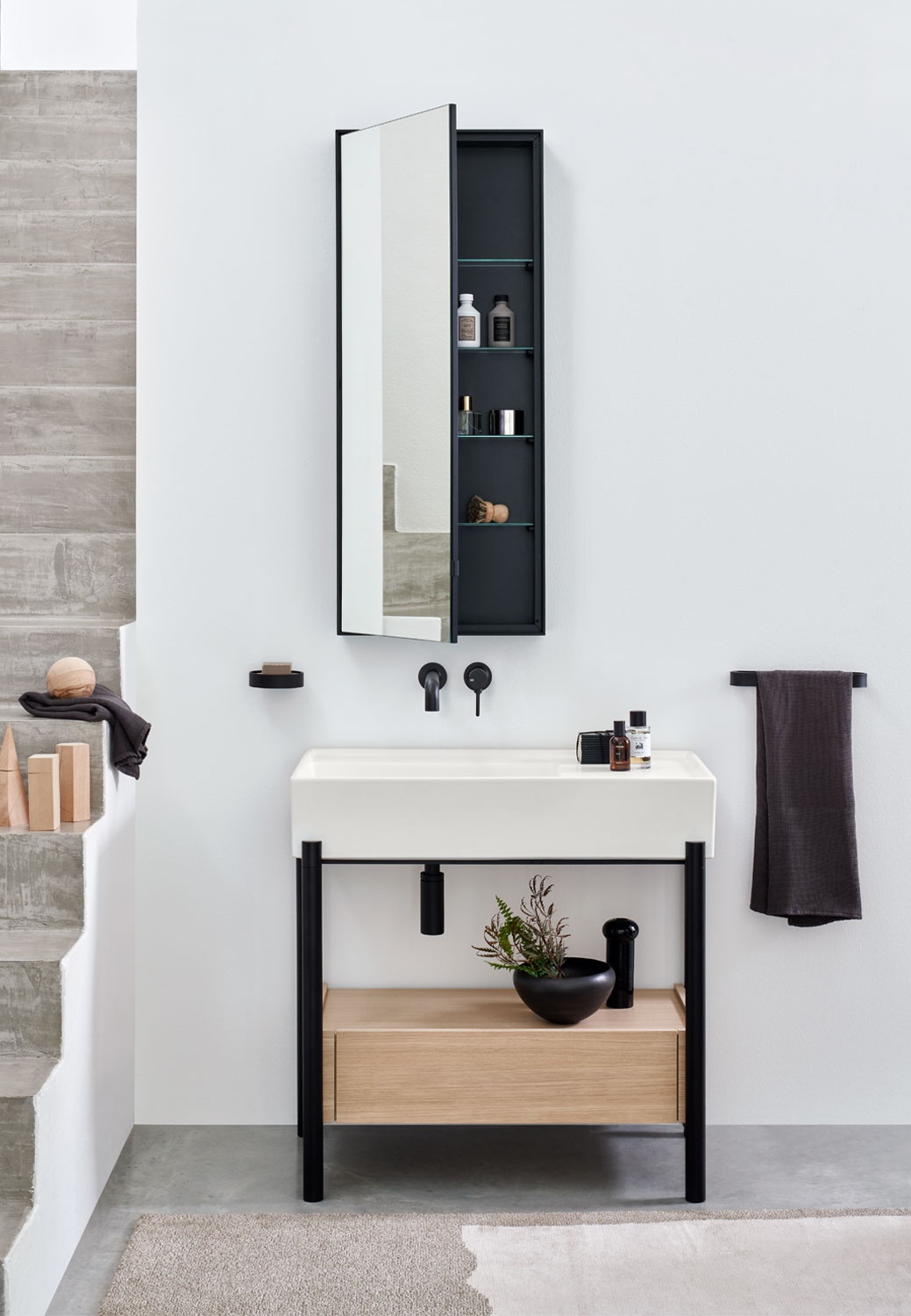 帶大盆和方便側(cè)架的陶瓷洗臉盆有多種飾面可供選擇,結(jié)構(gòu)有涂漆鋼飾面或各種珍貴天然木飾面的木材,模塊化擱板或?qū)挻蟮牡统閷希捎闷崮净蛟谔烊荒举|(zhì)飾面中。所有這些都由不同尺寸的皮籃完成。