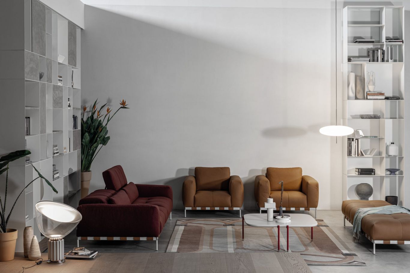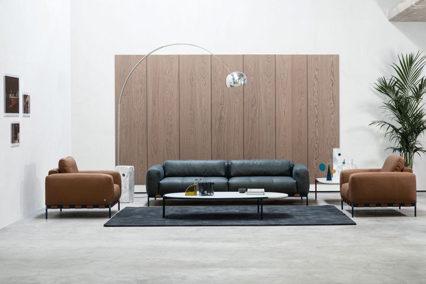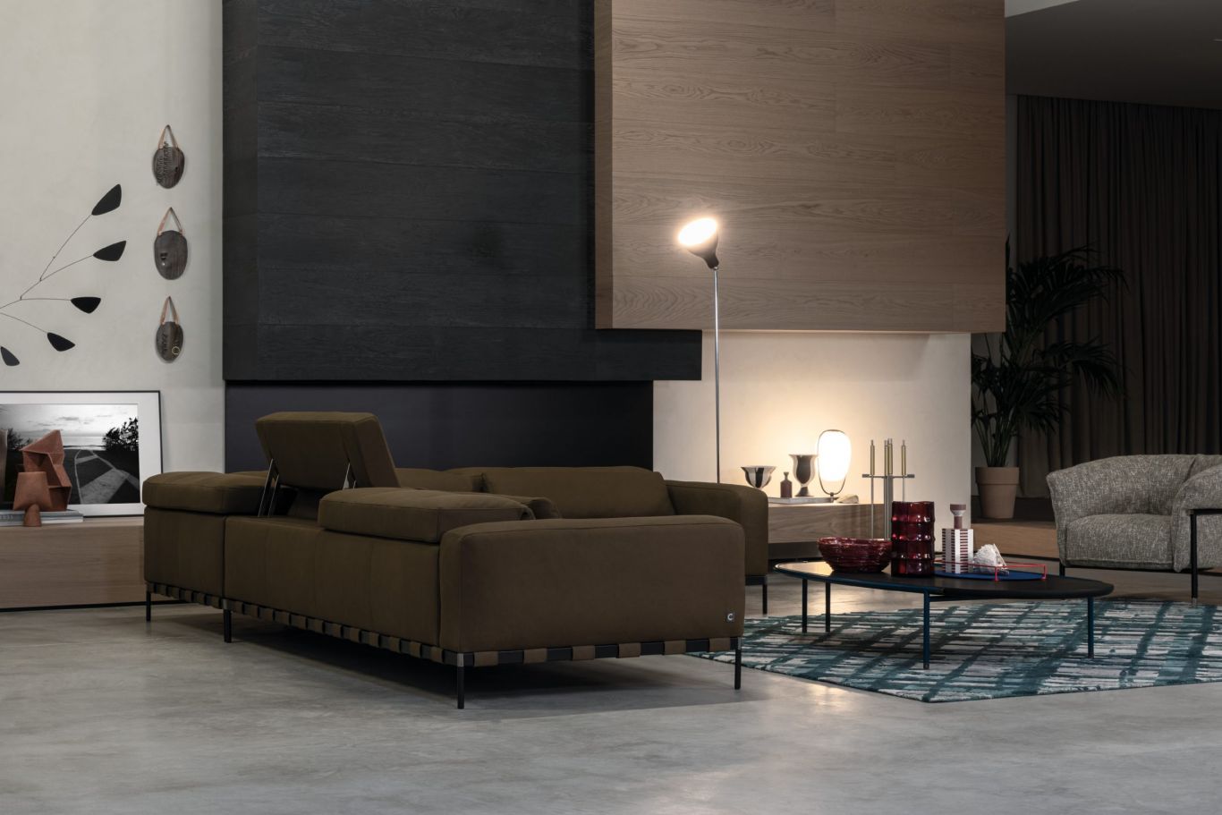 Divano elegante e moderno, con un’ampia gamma di elementi per comporre la configurazione che si desidera. Il meccanismo dello schienale consente di coniugare design e comfort. Il basamento è in metallo verniciato, la scelta possibile è tra 7 colori di RAL. Negli angoli del basamento c’è un angolo cromato, nelle tre finiture Nero, Lucido e Oro, che conferisce maggior prestigio alla composizione. Le cinghie in pelle della base, in tutti i colori disponibili del nostro campionario, creano un accattivante gioco di colore.