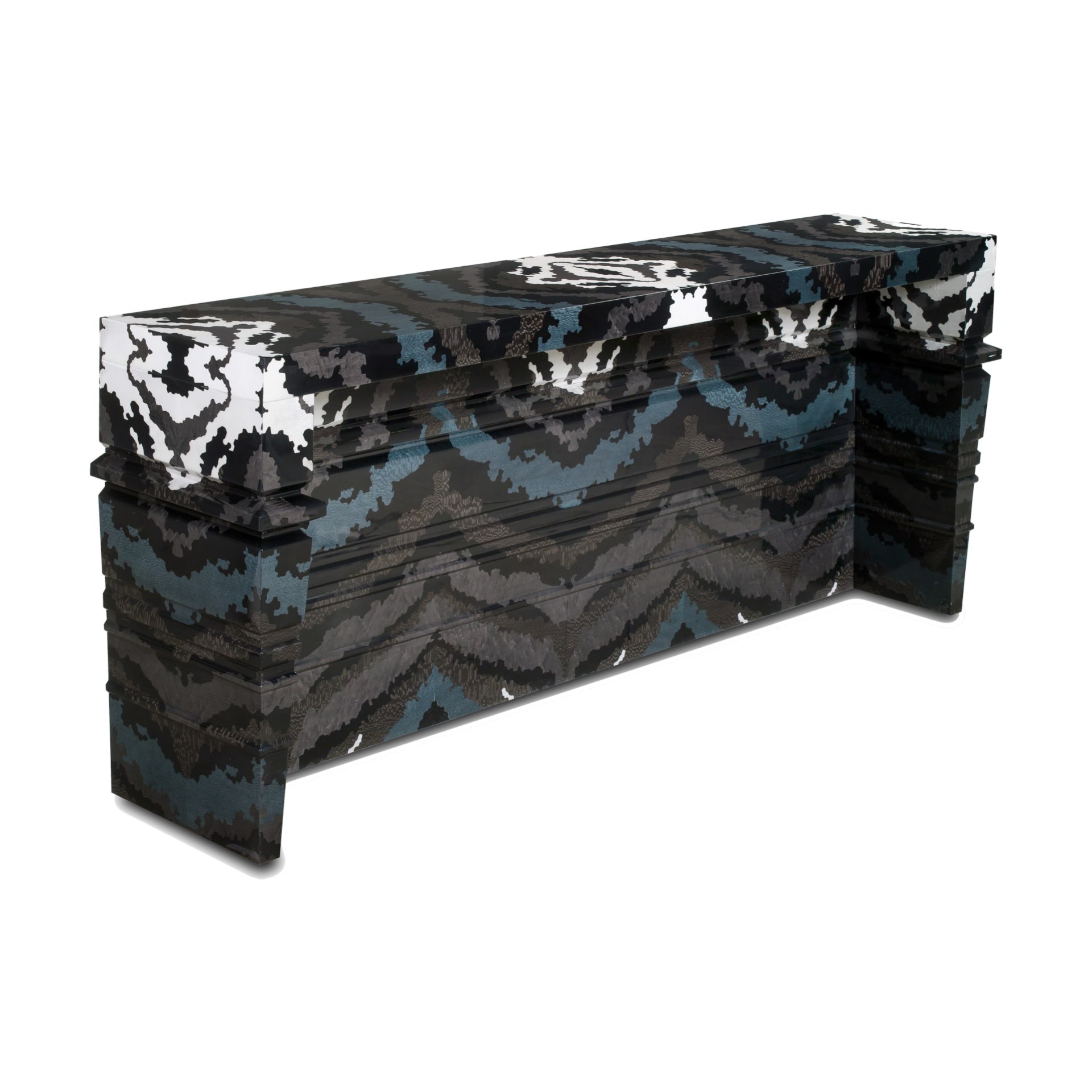 Struttura in legno listellare impiallacciato con finitura MIMETICA lucido poliestere. Top in finitura MIMETICA lucido poliestere. Struttura incisa.