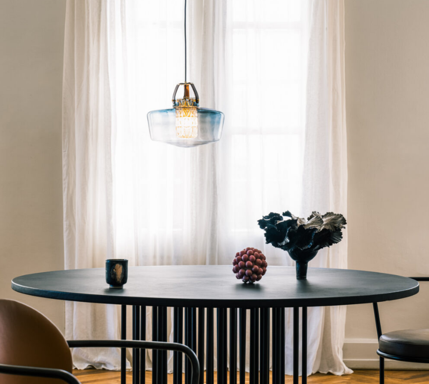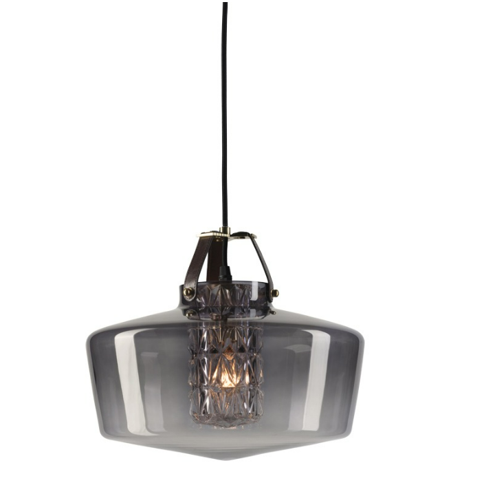 Addicted to Us is an aesthetic and raw pendant. The composition of the materials gives the lamp a great light and unique look. The lampshade is made of smoke coloured glass with a brass or black top and with either cognac or black coloured leather straps.