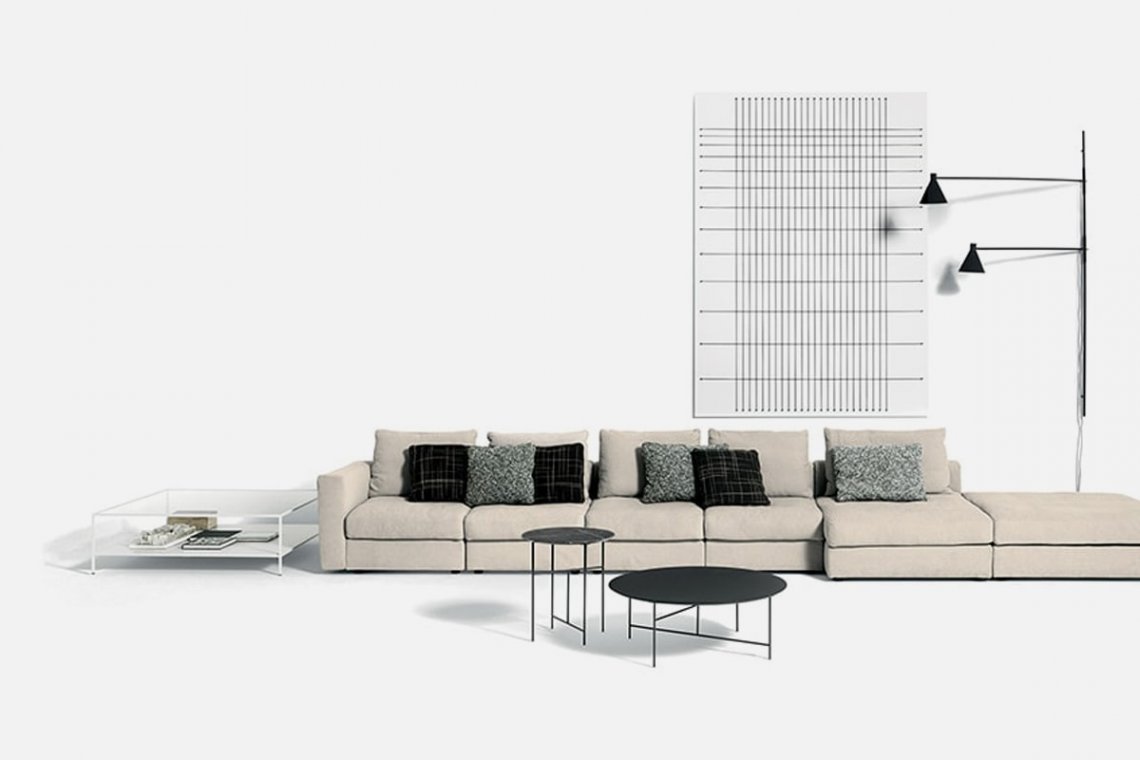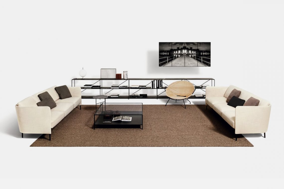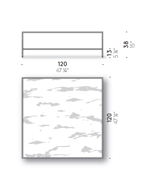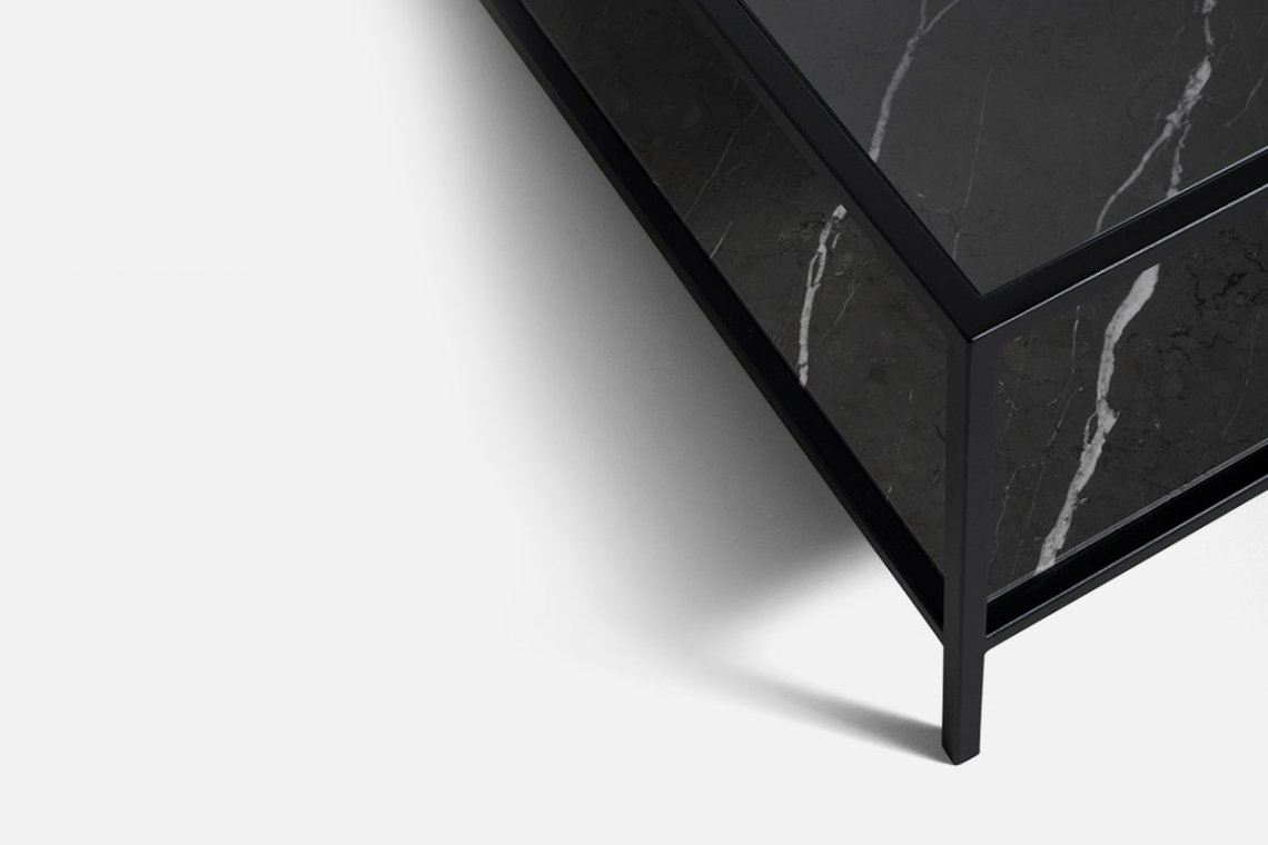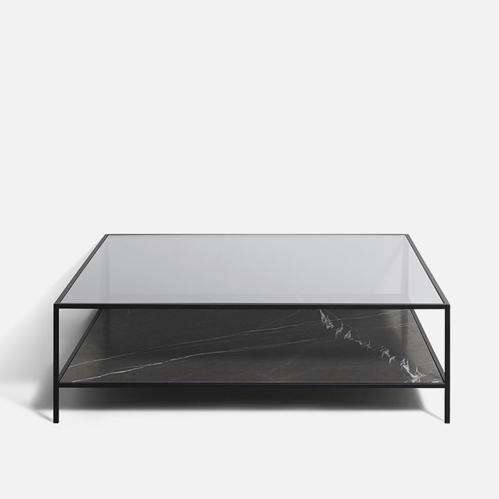 This square coffee table was designed as a surface for a cup of coffee, art books, and even a sculpture. The square tubular structure supports a lower shelf in white or black wood or in marble or in MDI composite, where objects are protected but in full view, while the top is made of glass or grey smoked extralight glass for an effect of absolute lightness.
