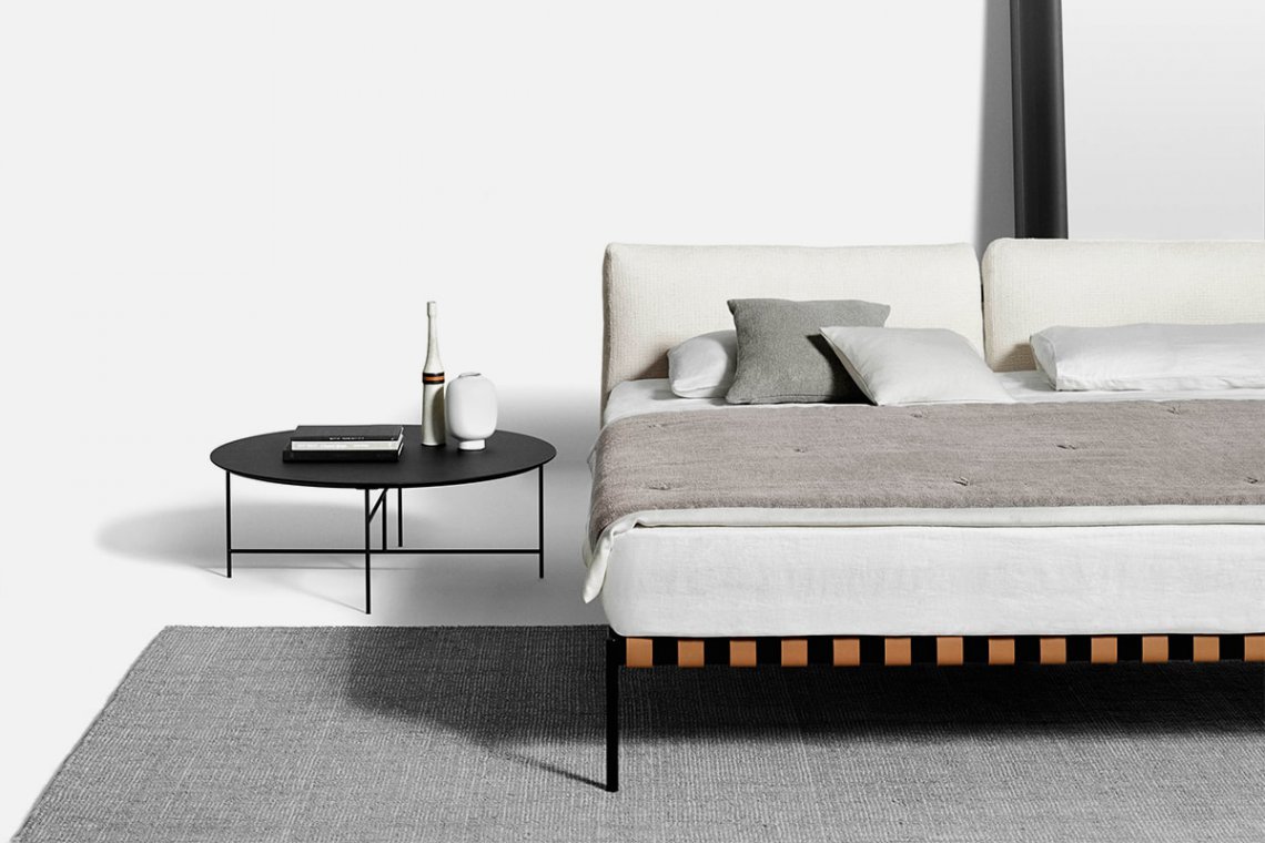 Scandinavian inspiration and outstanding Italian craftsmanship are the hallmark of the étiquette collection, the project by the duo GamFratesi, here in the bedroom version. The regular and cohesive matte black steel frame is completed by leather straps and a charcoal-colored ash wood bar. Two large goose down pillows that form the headboard are extra comfy for relaxing and reading before bedtime.