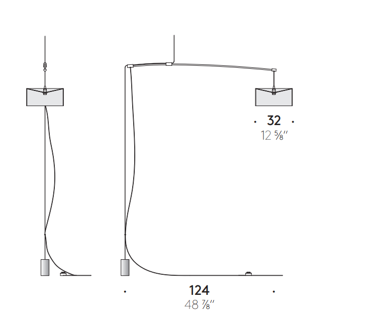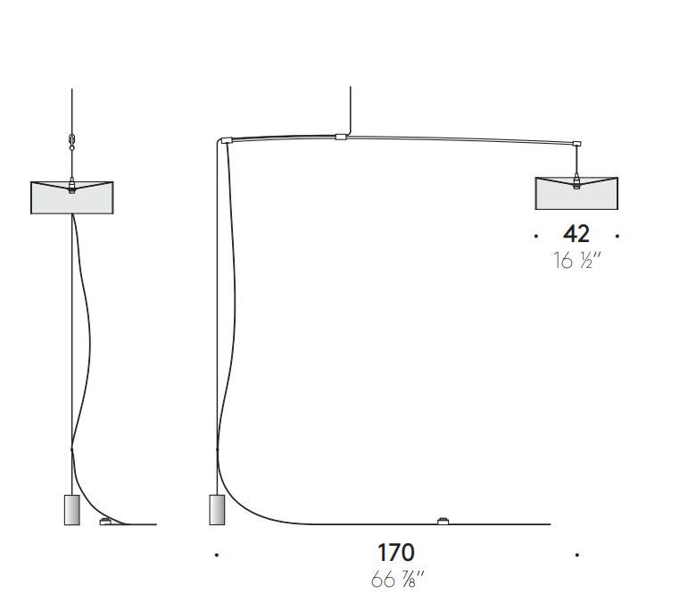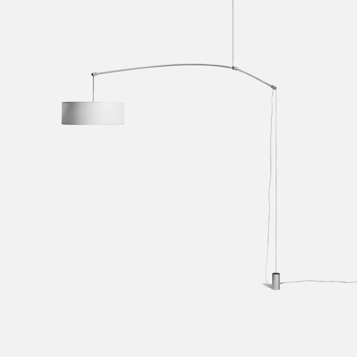 A perfect balance of form and function, DT Light by Phil Luithlen combines the characteristics of a fixed suspension lamp with those of a floor lamp. It is a calibrated test of precision where the arm suspended from the ceiling is balanced on the ground by a cable with counterweight. The suspended shade floats in the air: it can rotate 360 degrees and the height is adjustable.