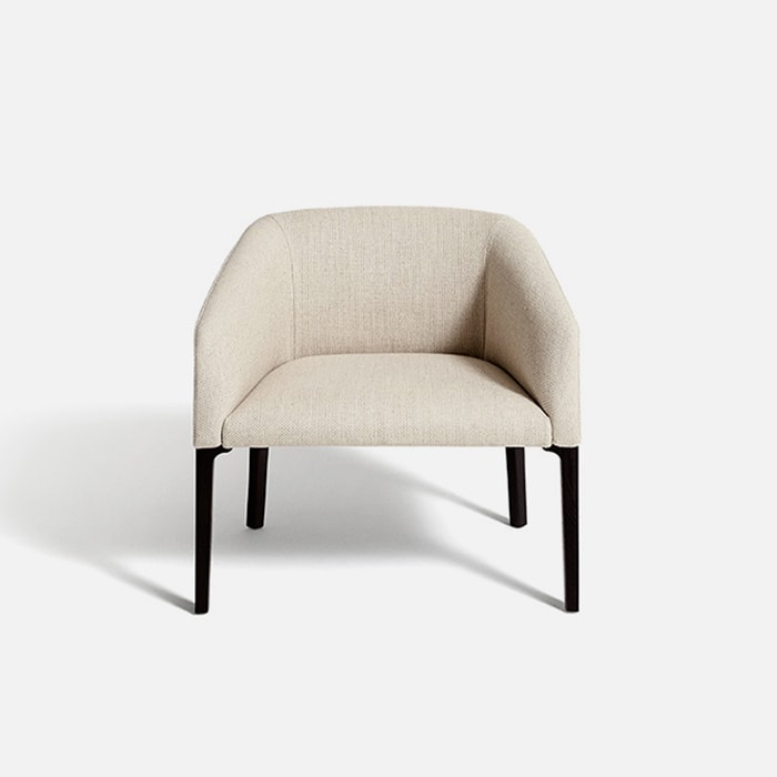 The Chesto armchair by Patrick Norguet is a re-edition of an archive project with a wider, lower and more comfortable seat. The armchair with stained ash wood legs can be upholstered in fabric or leather. Its balanced shape with understated but never banal elegance is an experience to be enjoyed each day.
