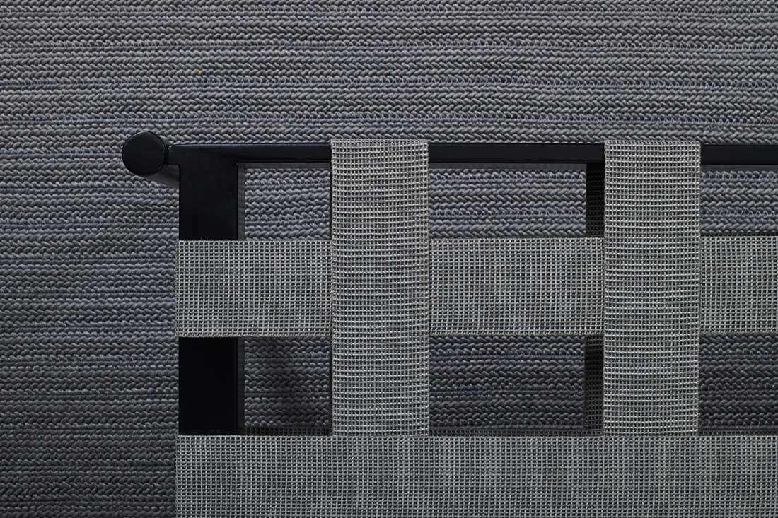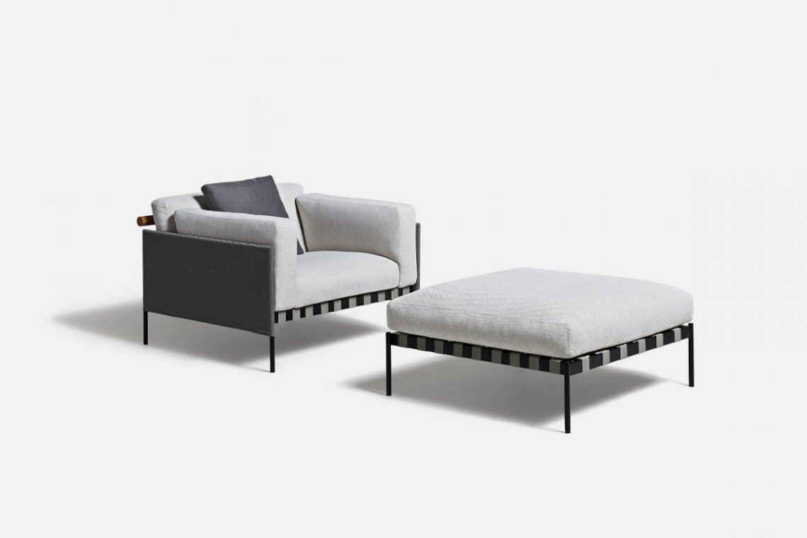 étiquette is a Scandinavian-inspired project that dialogues with superior Italian craftsmanship. Developed by design duo GamFratesi, the model includes a sofa, pouf and armchairs. The indoor piece lends itself perfectly to the outdoors thanks to a selection of finishes. The outdoor version features a body in matte black painted stainless steel that is complemented by elastic straps in a water-repellent fabric and a wood bar in natural teak. The atypical design is simple and essential, making it an excellent solution to mark out a space thanks to its unusual back view. The mood is completed thanks to functional aesthetic elements and refined combinations of precious and resistant yarns in neutral hues. étiquette Outdoor is paired with the Fezzan carpet, which is in Olyna, a recyclable, non-toxic and hypoallergenic water-resistant material that recalls the same natural tones of the armchair, pouf and sofa.