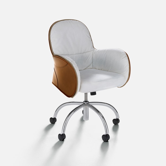 Like a saddle trimmed with top-stitching, Serbelloni is the quintessential swiveling executive office chair. Designed by Vico Magistretti, it reclines, is height-adjustable and has swiveling castors and a safety brake (it also has versions for wood or marble flooring). The artisan craftsmanship of the leather exterior goes hand in hand with the contrasting or tonal lining in removable fabric or leather.