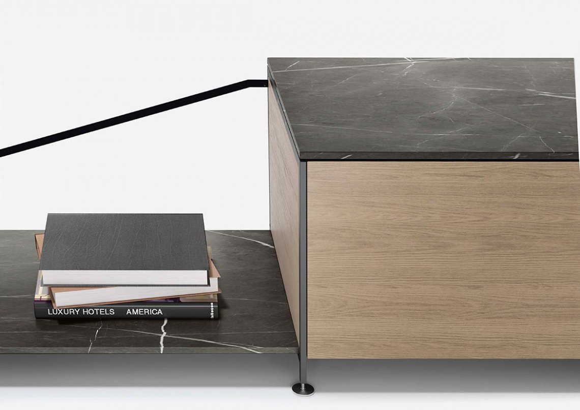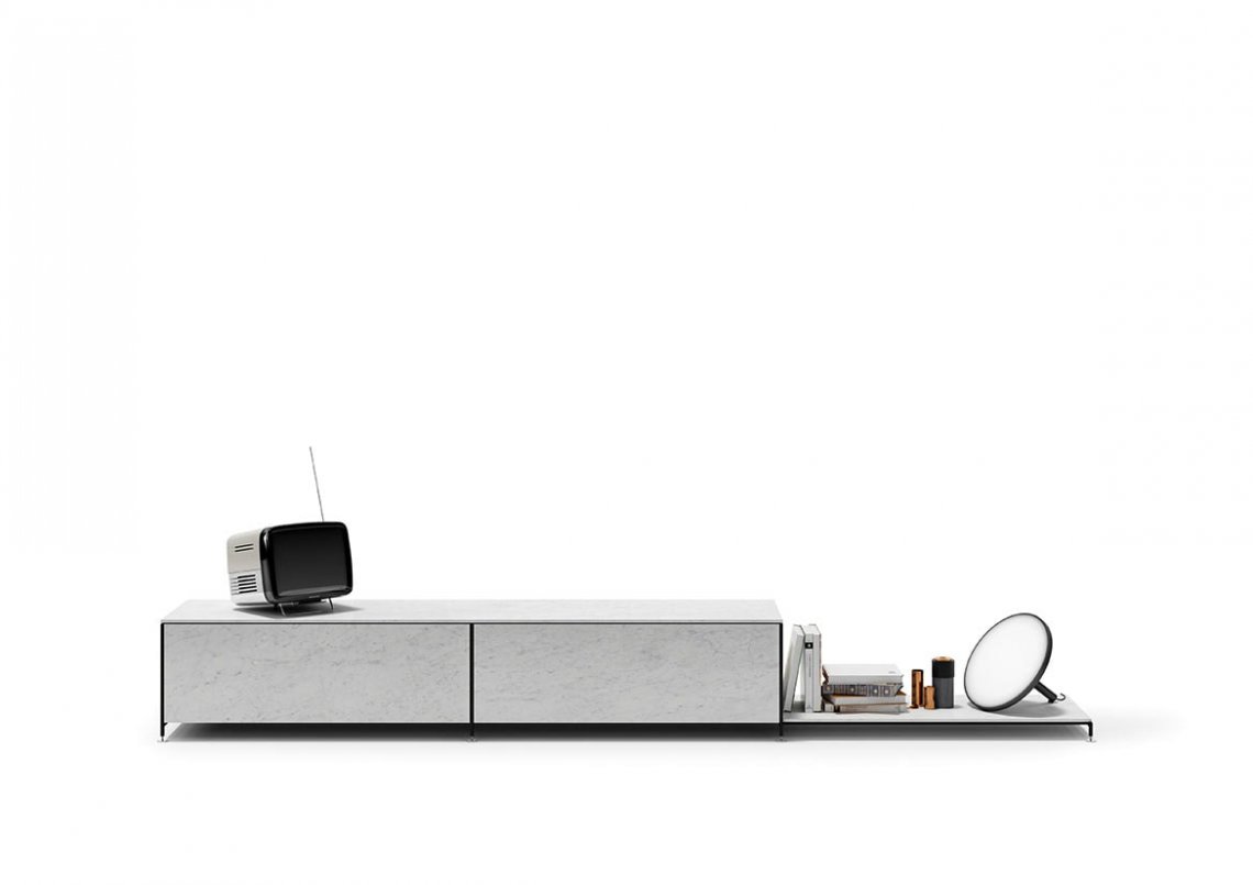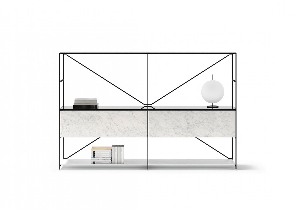 The modular R.I.G. shelving system is able to transform into any number of low profile furniture solutions suitable for the living room, study, entrance hall and dining room, including television stands, small tables for lighting, credenzas and low height bookcases.