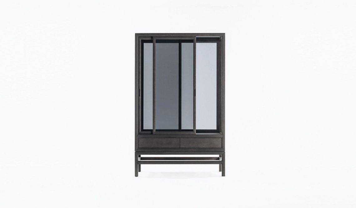 Sliding doors are an element that strongly characterizes traditional Japanese design. We find them in this contemporary double-door interpretation of the classic wardrobe, with drawers on the bottom for small objects and accessories. Also available in single version with hinged door, the wardrobe is made of solid bleached or charcoal gray oak wood.