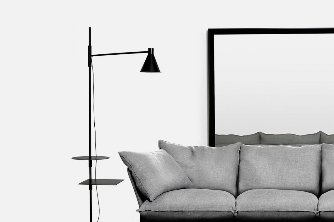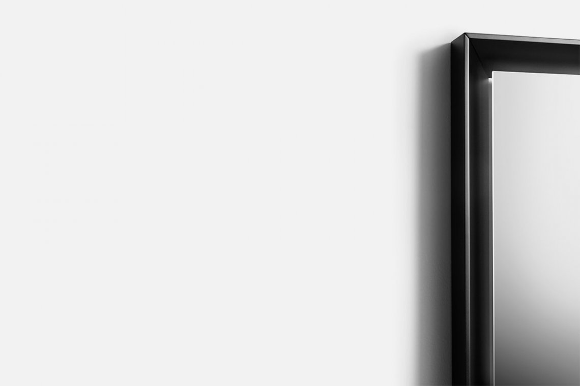 The narrow matte black frame surrounding the SP14 mirror has a square shape and beveled corners. The simple but not plain accessory chooses a corner of the home to frame and reflect ever-changing images.