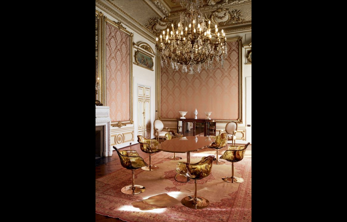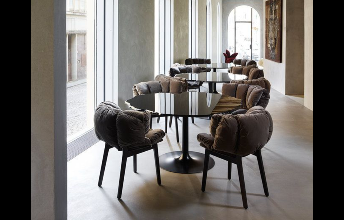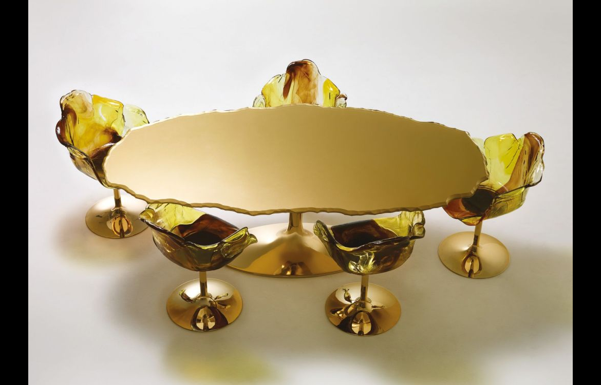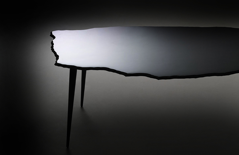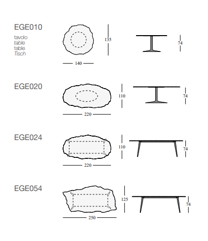 This series of glass tables with irregular, elliptical or round tops.