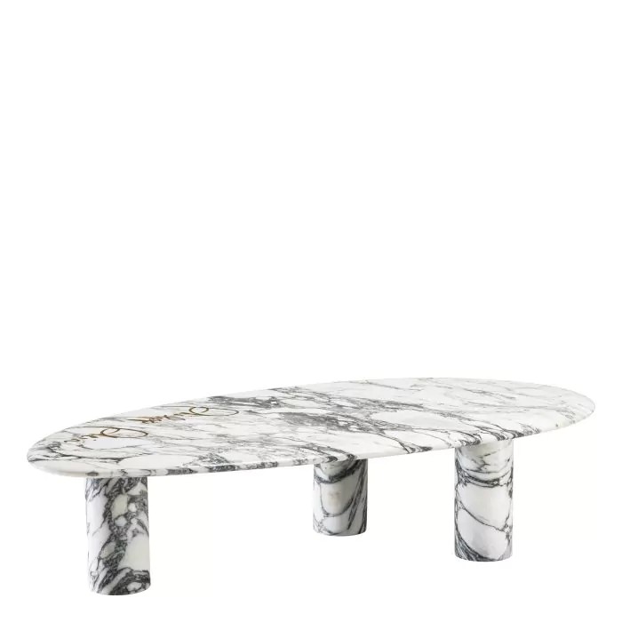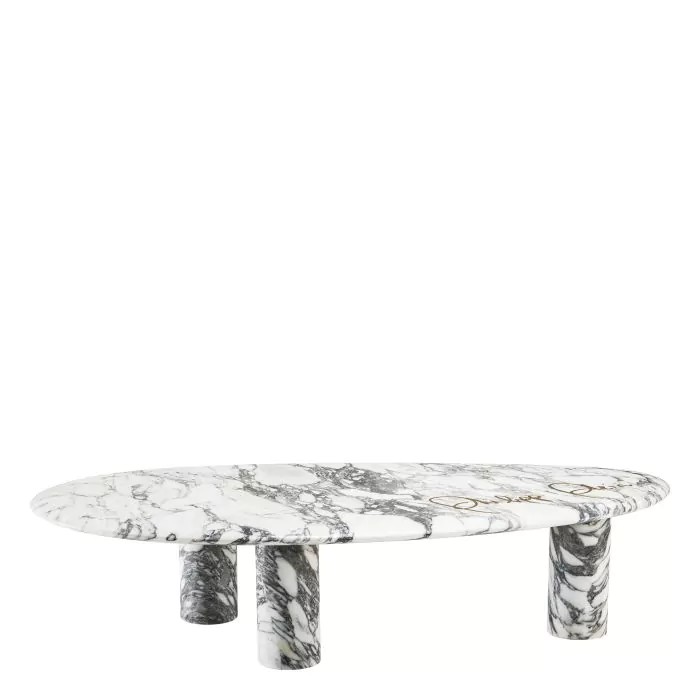 With its voluptuous curved organic form, the Forte coffee table has been carved from white Cararra marble by master craftsmen and finished with the dynamic Philipp Plein signature in gold.