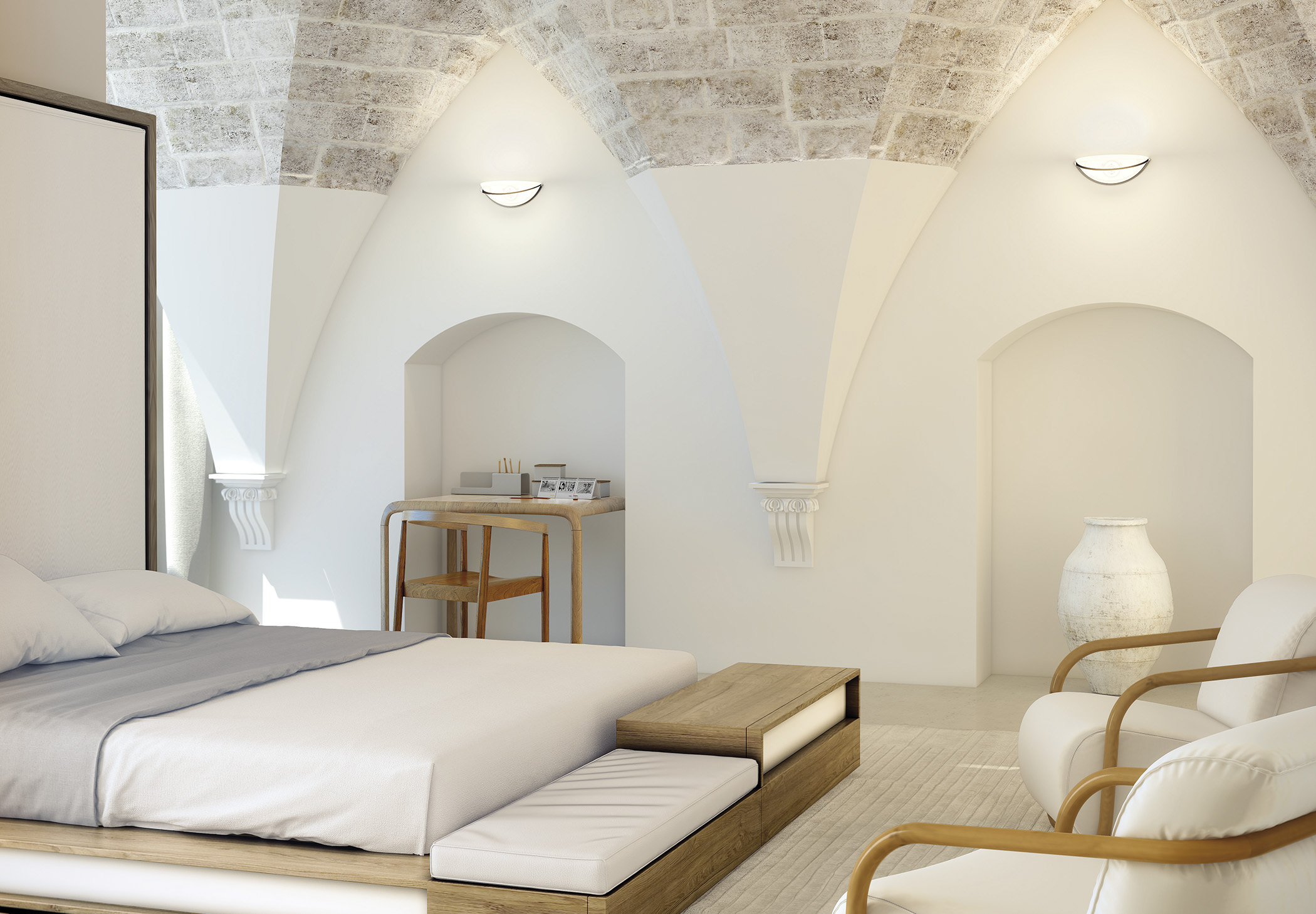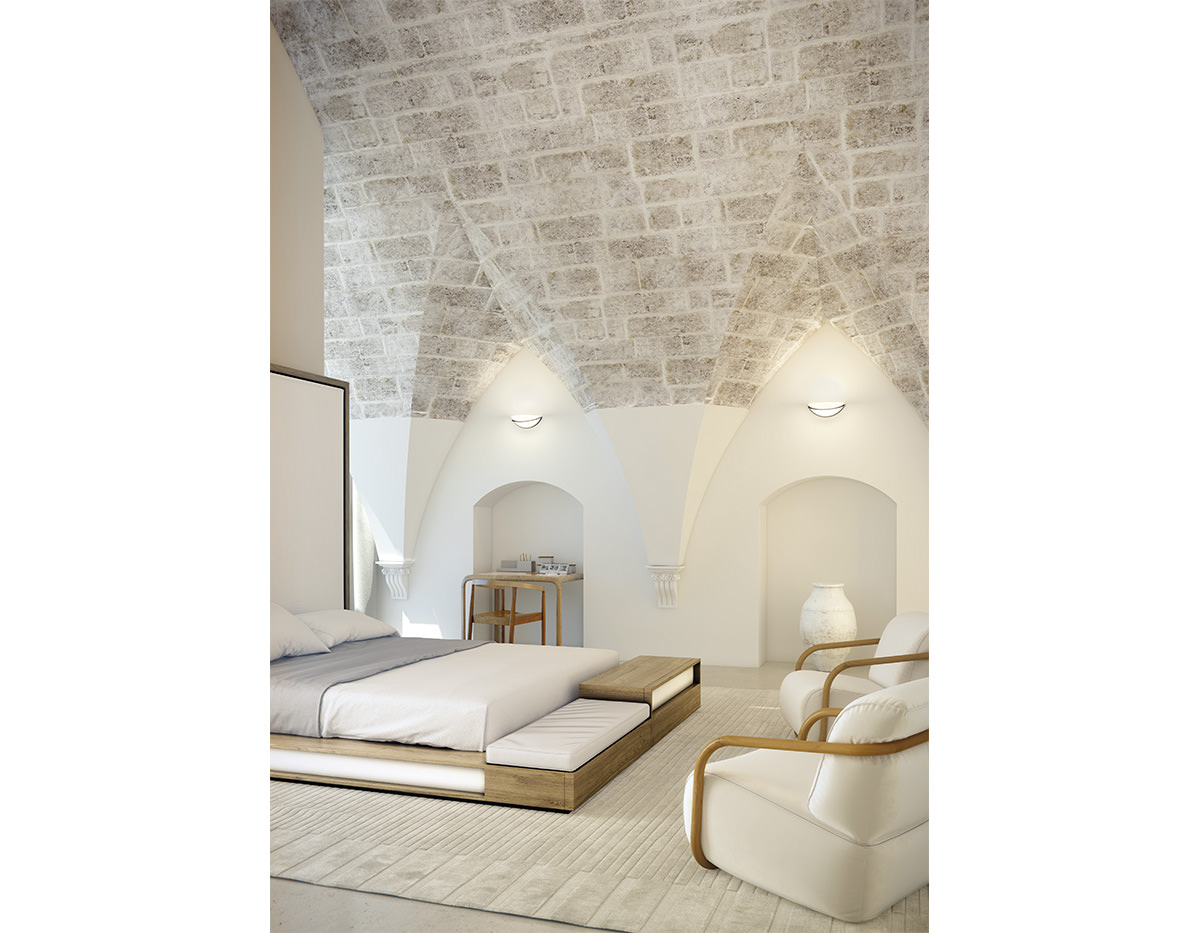 Metallic wall lamp with glass shade and integrated dimmable LED.