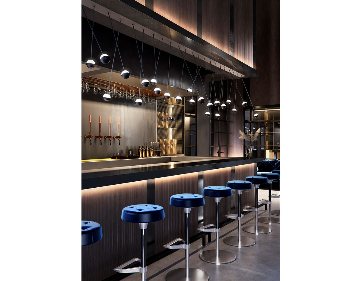 Delicate as a flower and as functional as a pin, Alfi's light emerges from a glass orb, softened with a metal cap. Linear and curved modules can be put together to create suspensions that meander across the ceiling as well as form oval, square or linear configurations. Metal stems on ball joints at the canopy enable easy adjustment.