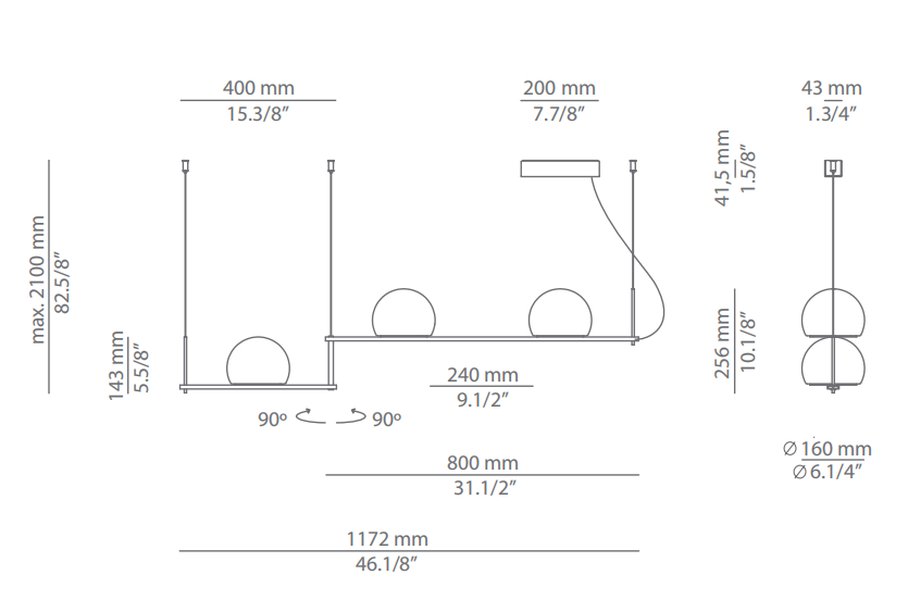 Metallic suspension lamp providing direct and indirect light. Glass shades and integrated dimmable LED. Adjustable height and can be mounted facing upwards or downwards.