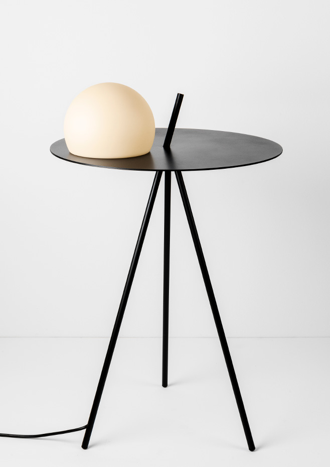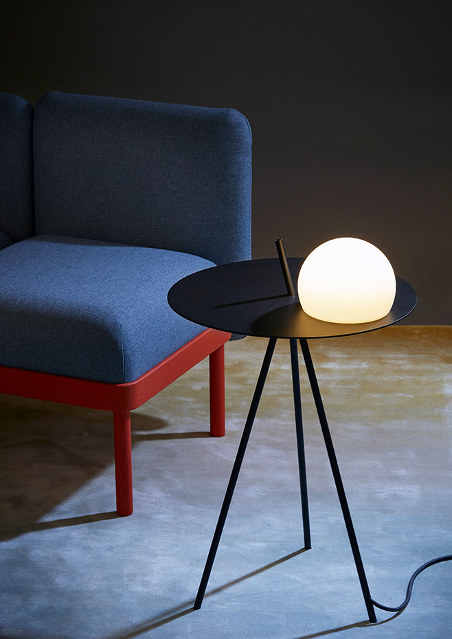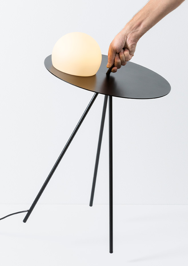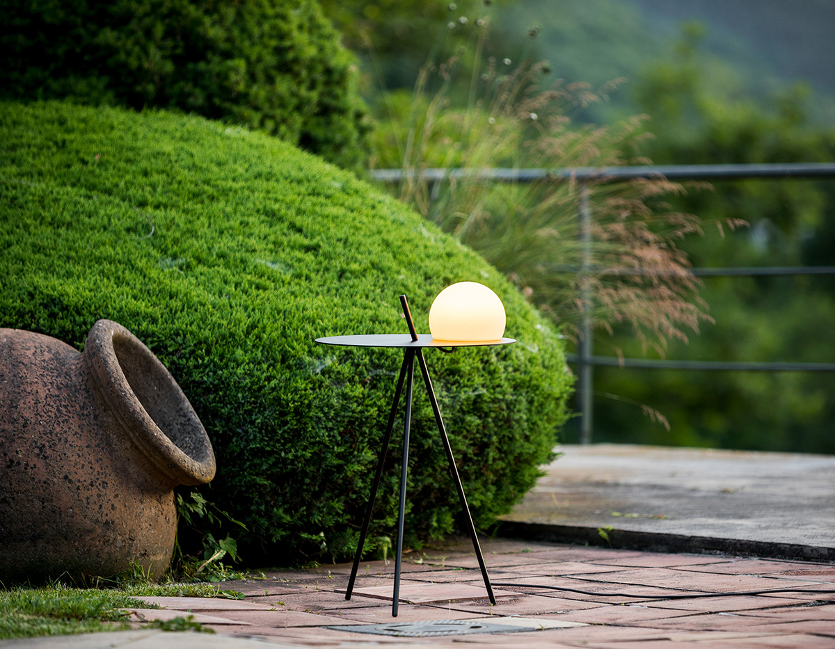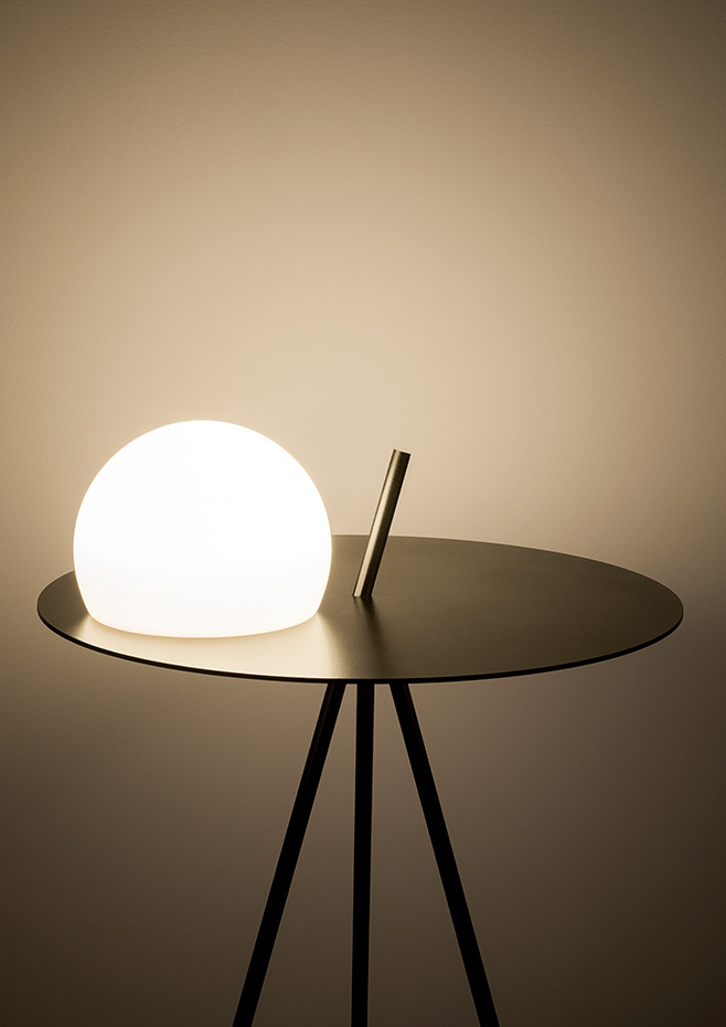 Illuminated metal table with integrated LED providing direct and indirect light.