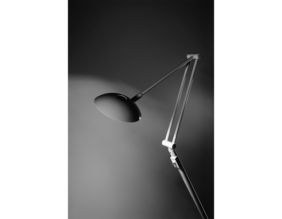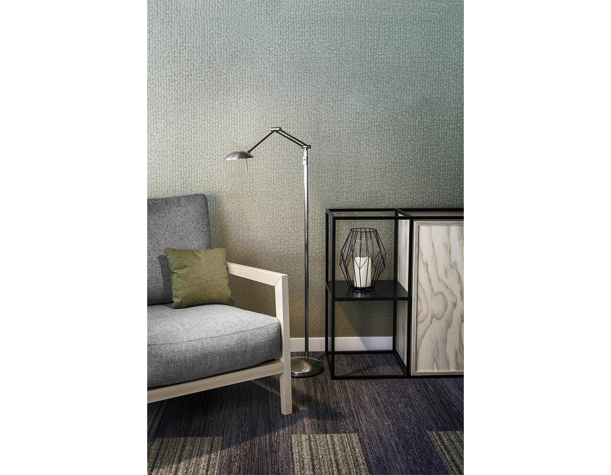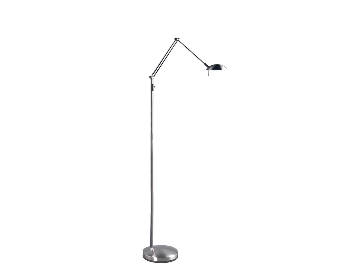 Metallic reading lamp with extensible reading arm and articulate head, providing direct or indirect light. Integrated LED with push button dimmer.