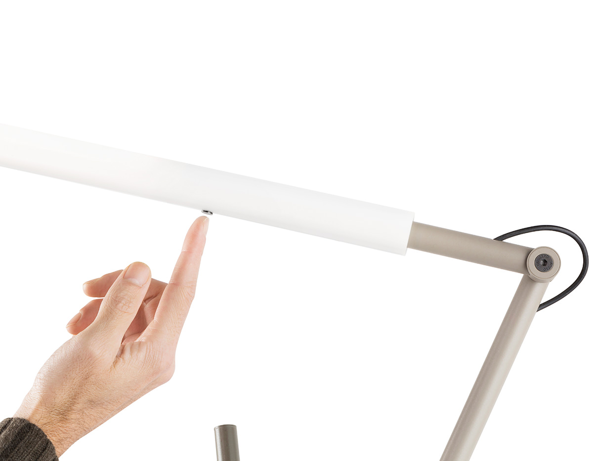 Metallic floor lamp with three multifunctional arms. Direct and indirect light provided by an adjustable arm with acrylic diffuser and integrated dimmable LED on the stem. Accessories can be added to the stems such as a table or magazine holder.
