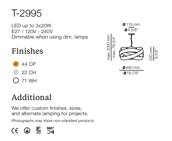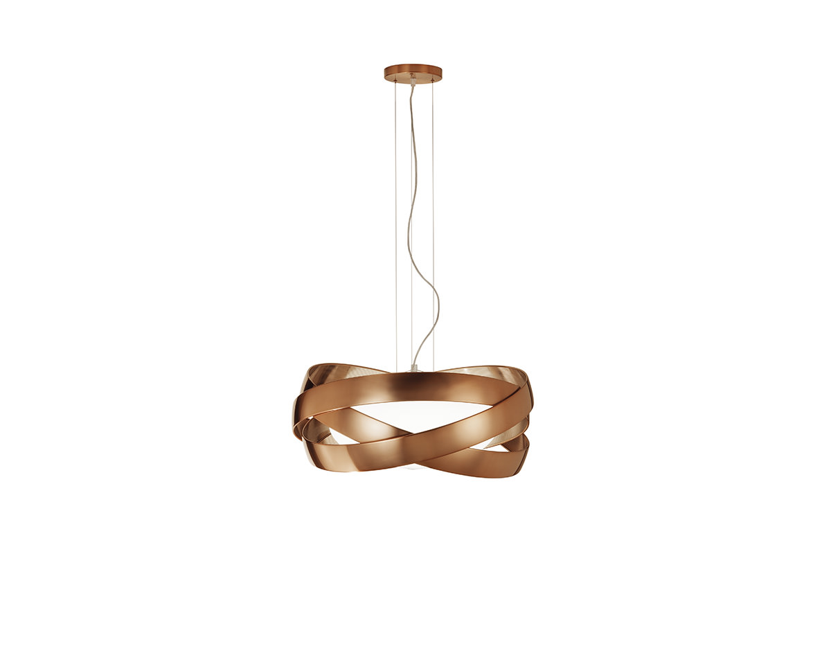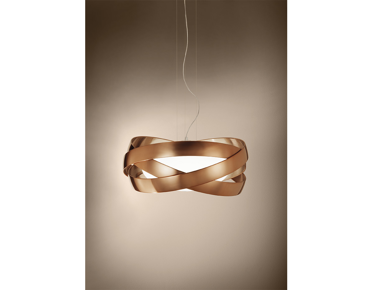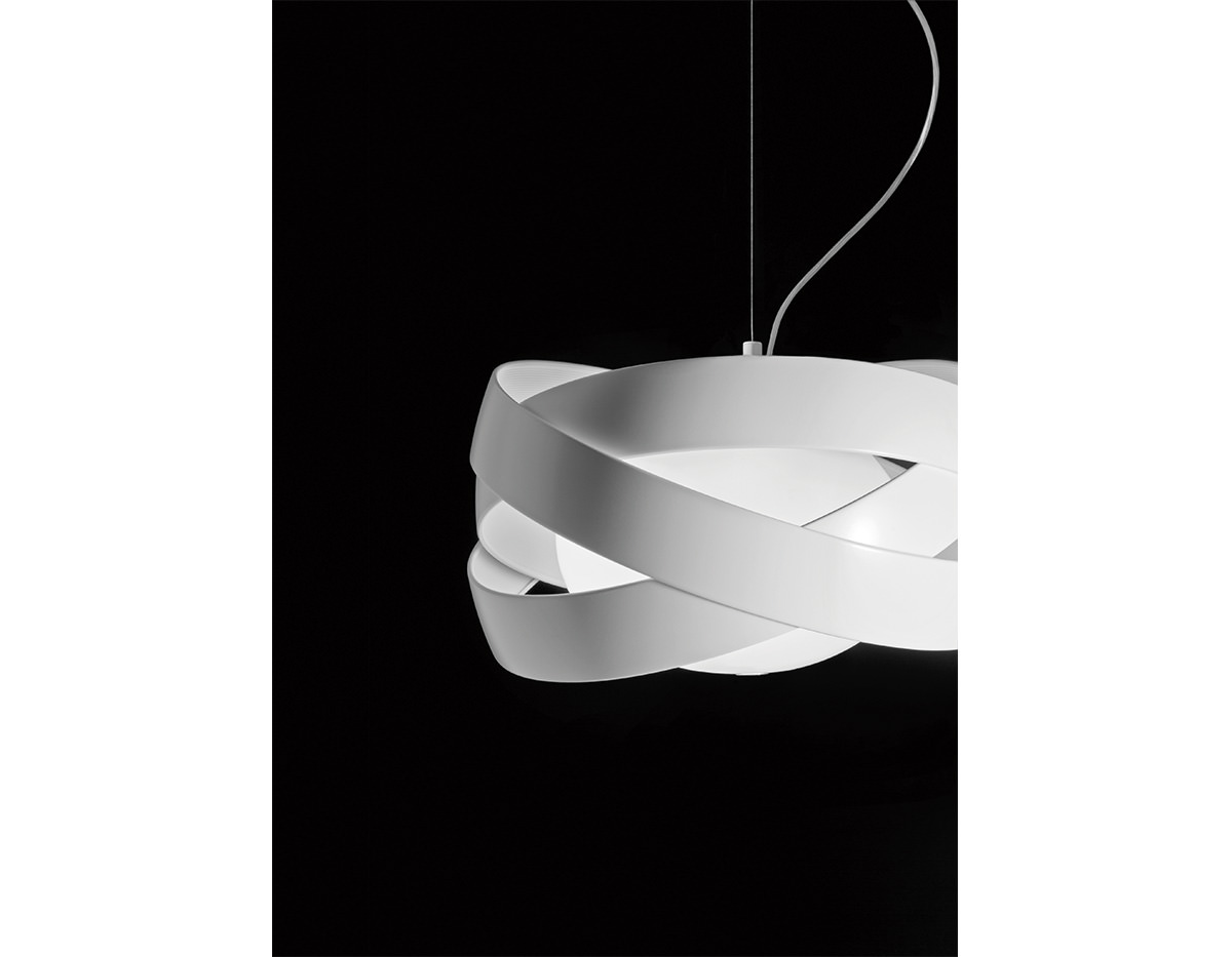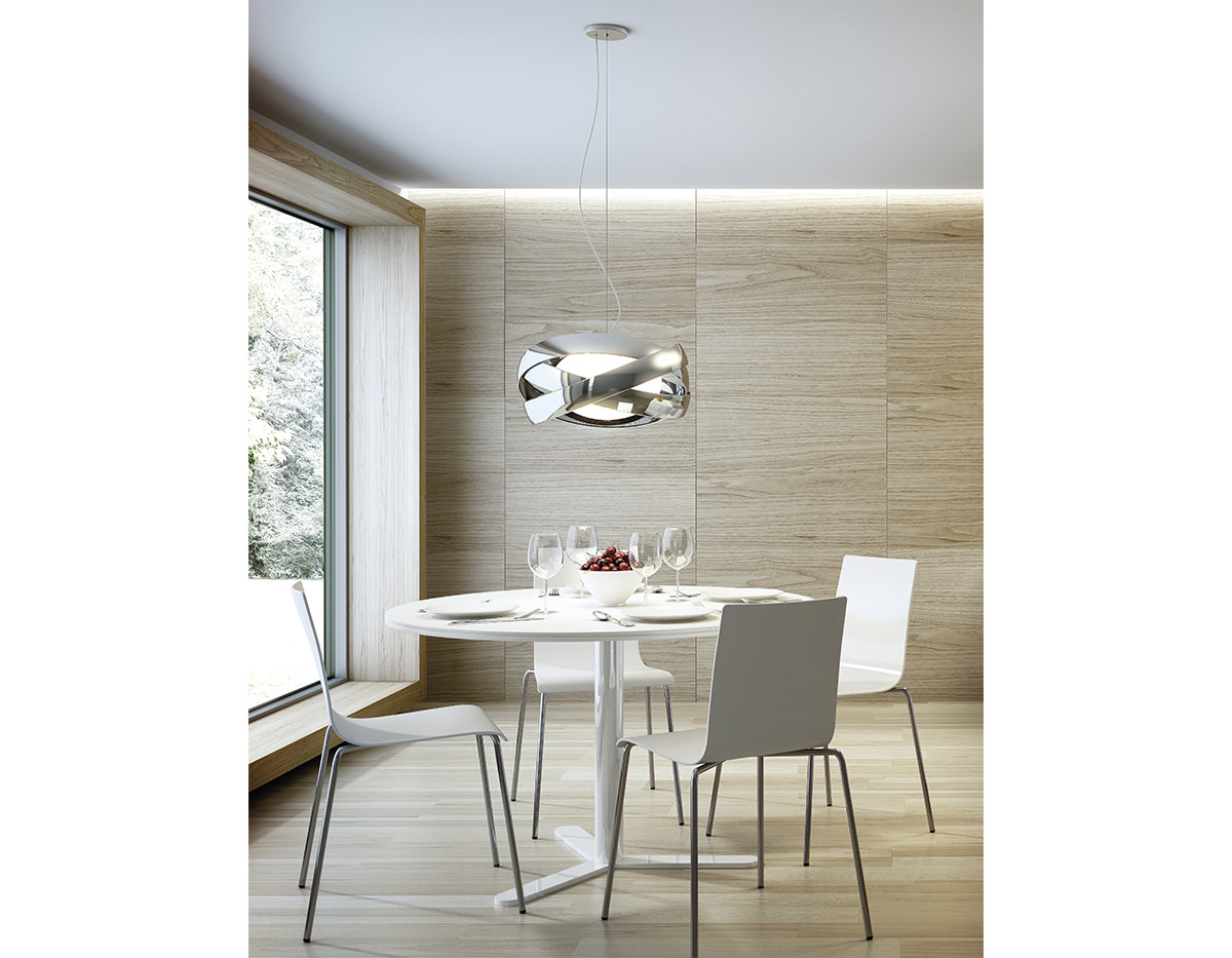 Pendant providing direct and indirect light. Shade is made of a satinated glass and decorative aluminium rings. Adjustable height.