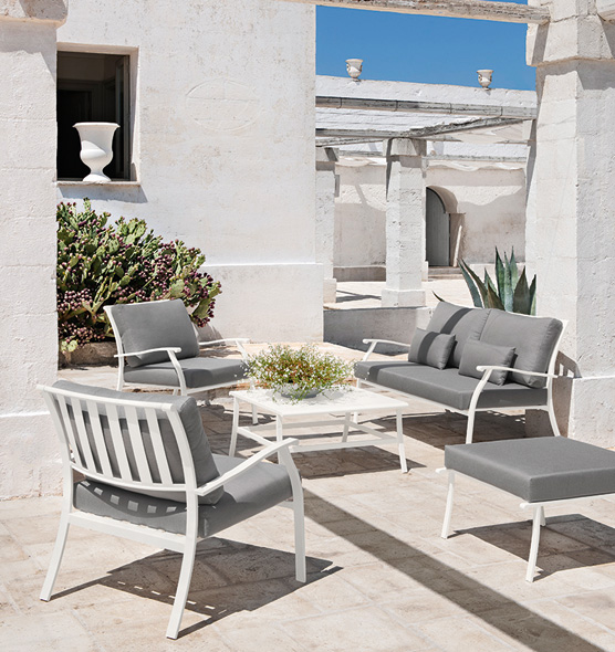 This furniture collection, inspired by classic design yet ready to meet all contemporary outdoor living needs, displays a timeless style with a complete and coordinated range, from seats to tables and accessory items.