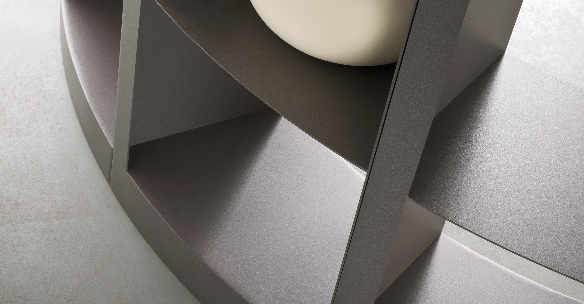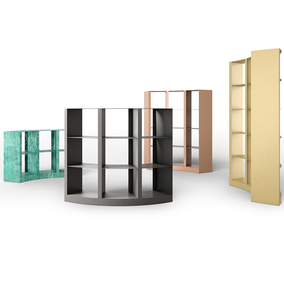 DODA is a self-supporting double-sided conical section bookcase ideal for dividing up spaces by combining multiple modules. Flexibility and modularity, geometries and designs to be created at will. Like a metal monolith, embellished by numerous variants of metallic or satin finish, it is placed in the surrounding environment expressing its nature with vigor.