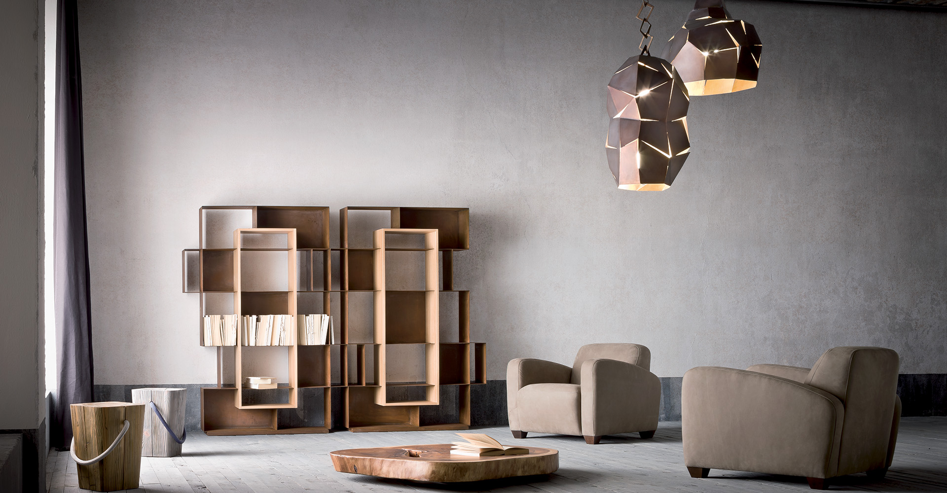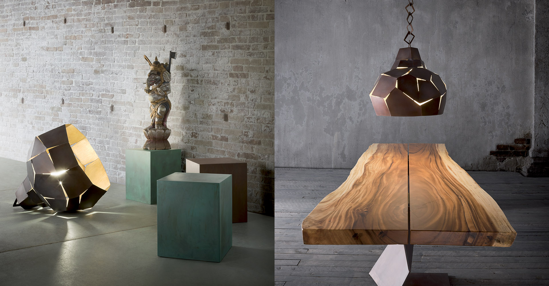 Asymmetrical light cuts spread in all directions, enhanced by the luster of the gold leaf that covers its interior. EKFLAMO is a suspension lamp in metal obtained from a bent and welded metal sheet, available externally in nickel, bronze, brass or lead diamond metal finishes or in manual burnished etched finish.