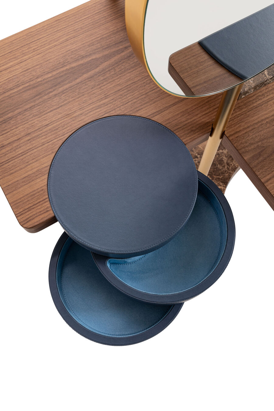 The Vanitoso dressing table, designed by Atelier O?, is a stylish homage to femininity. The steel structure and duo of round mirrors create an intriguing interplay of light reflections, unusual geometric forms and sinuous lines. The base and top in honed marble create a sophisticated tactile contrast with the shelf in American walnut or oak while leather detailing adds an elegant touch of the distinctive colour that has long been synonymous with Fendi creations.