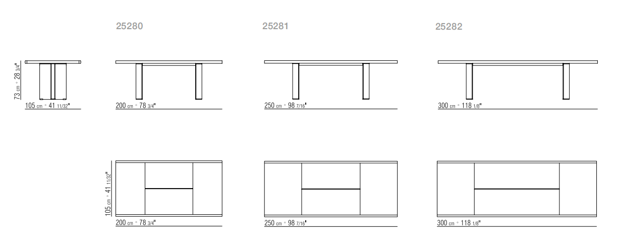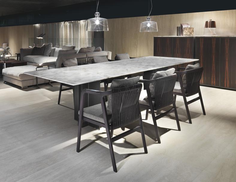 兩個(gè)雕塑般的噴漆金屬底座,為Spello桌子賦予了鮮明的個(gè)性。靈感源自粗獷主義,在建筑藝術(shù)方面表現(xiàn)為干硬粗糙的造型,結(jié)實(shí)的結(jié)構(gòu)。 與底座的粗野相對(duì)照的是芯材木板的詩(shī)意質(zhì)感,木板設(shè)計(jì)呼應(yīng)著鑲嵌傳統(tǒng),一道纖細(xì)的縫隙沿縱向穿過木板,使這種質(zhì)感更為突出。 Spello桌子只有長(zhǎng)方形桌面,表面鑲有卡納萊托胡桃木、梣木與烏木薄飾板,有多種顏色。還有多種大理石飾面的款式。