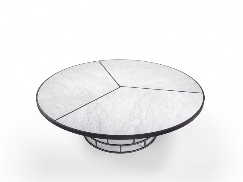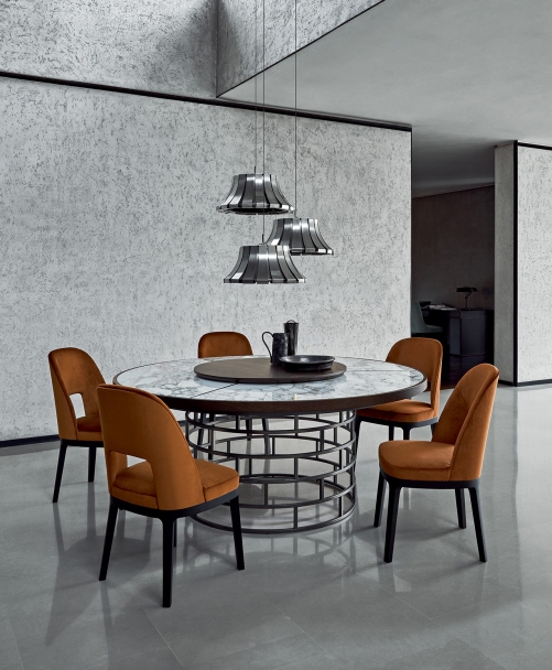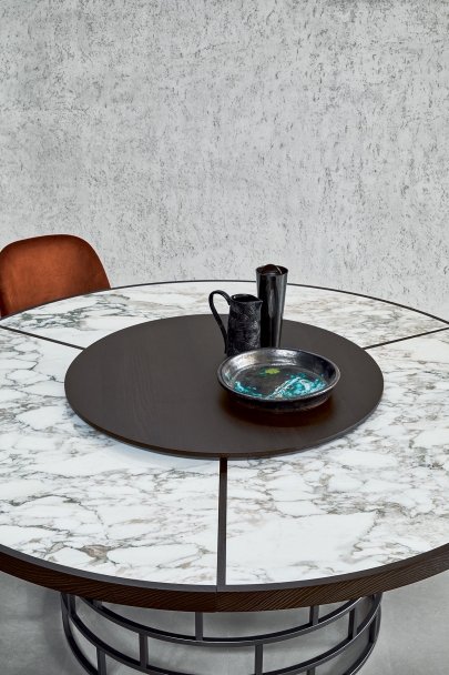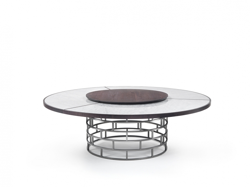這是一款筵席桌,設(shè)計(jì)考究,選用了名貴材料。金屬底座的表面處理工藝有磨砂、鍍鉻、黑鉻、磨光、鍍銅和香檳色,呈現(xiàn)為一系列疊加的圓環(huán),并有垂直支桿交錯(cuò)其間,仿如一頂皇冠,也成為了餐桌名字的來源。 輕盈空靈的底座承托起寬大的天然歐洲白蠟?zāi)咀烂妫善岢刹煌伾в写罄硎b飾。 Crown桌子可加入一個(gè)精致實(shí)用的配件:Lazy Susan,這是亞洲文化中流行的轉(zhuǎn)盤,能夠讓賓客更方便分享食物。