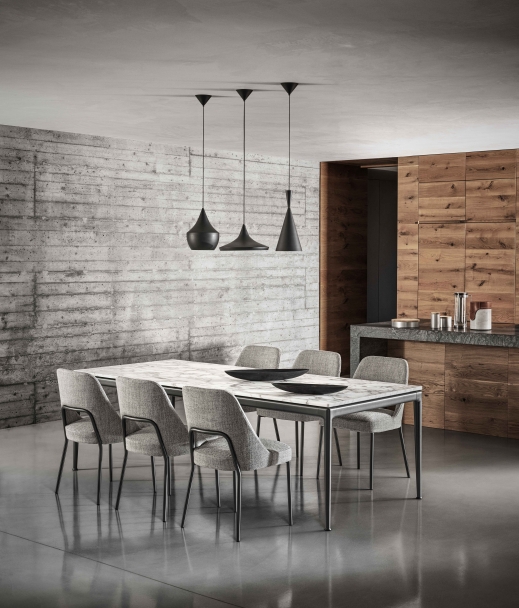Pico餐桌優雅的錐形腿賦予其流暢的動力和清晰的視覺輕巧感。腿由鑄鋁制成,具有許多時尚的飾面,而無鋒利的邊緣頂部可以由各種類型的大理石制成。或由飾有Canaletto胡桃木或白蠟木的木飾面制成。