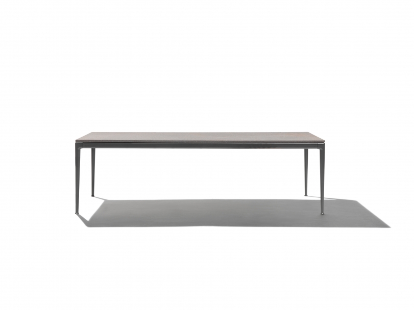 優雅的錐形腿由鑄鋁制成,并具有一系列精致的環氧粉末涂料飾面顏色。無鋒利的桌面可提供帶有iroko木板條的版本,或以下類型的石材:Beola Argentata,Pietra del Cardoso,Lava和Porphyry。
