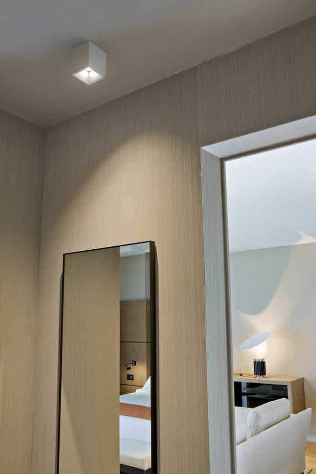 Recessed or ceiling mounted family of lighting devices, for indoor installation. The choice of a large variety of finishes guarantees perfect integration into the environment. Also available with the new LED lamps. With high cut-off, Kap offers great visual comfort.