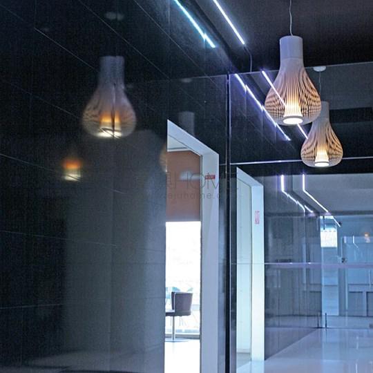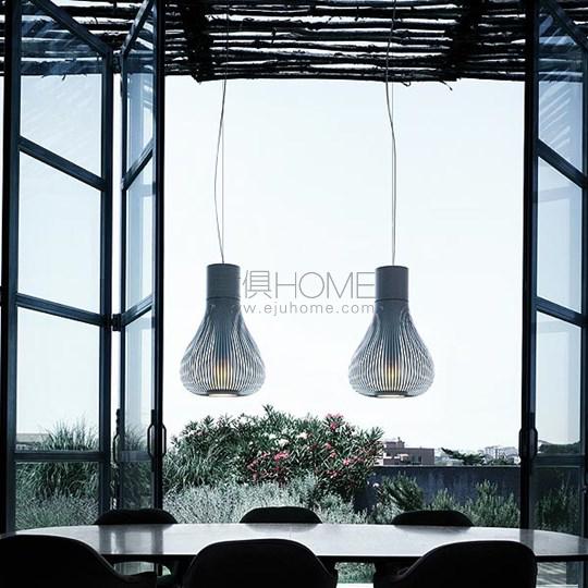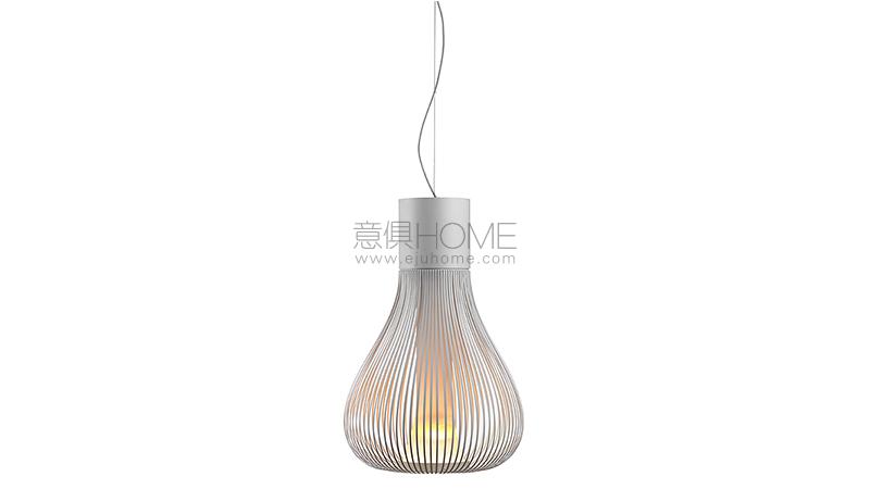 Suspension lamp providing diffused lighting. Chemically photo-etched stainless steel body and borosilicate diffuser. Liquid paint protection. Die-cast aluminum base, 30% fiberglass-reinforced polyamide ceiling rose attached to a pressed and galvanized steel ceiling fixture. In this version the light emission can be adjusted by means of a mechanical movement that opens the louvers, thereby varying the shape of the luminaire. Steel suspension cable, FEP/PVC power cord of the same color as the luminaire.