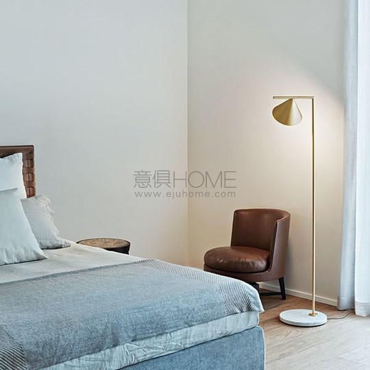 Floor lamp providing adjustable direct light. Painted steel or brushed brass, stem and metal spinning cone. Opal photoengraved PC diffuser by injection molding. White Carrara or Black Marquina marble base. Power cord length 260 cm, with foot dimmer switch that provide ON-OFF functions and 10-100% light adjustment. Plug-in power supply with interchangeable plugs