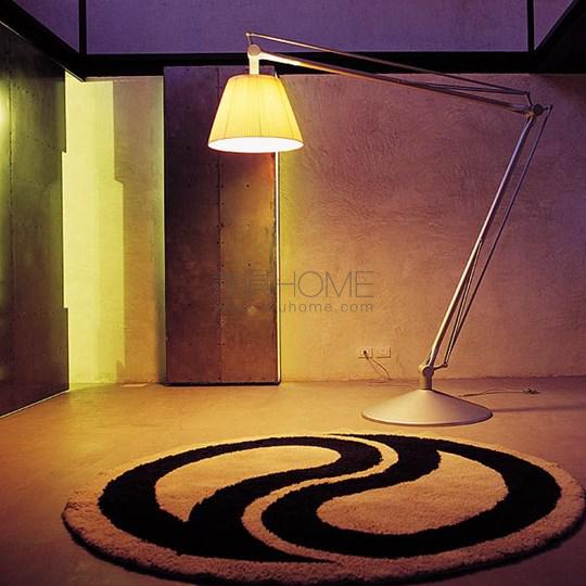 Floor lamp providing direct and diffused light. Acid-etched hand-blown pressed borosilicate glass internal diffuser. Plissé cloth external diffuser. Sand-cast, aluminum diffuser support. Gray painted assembly composed of tubular aluminum arms and tie rods, stainless steel springs, and die-cast aluminum joints. Sand-cast aluminum base with gray painted spun aluminum cover. On the cable there is the electronic dimmer which allows the regulation of light brightness.