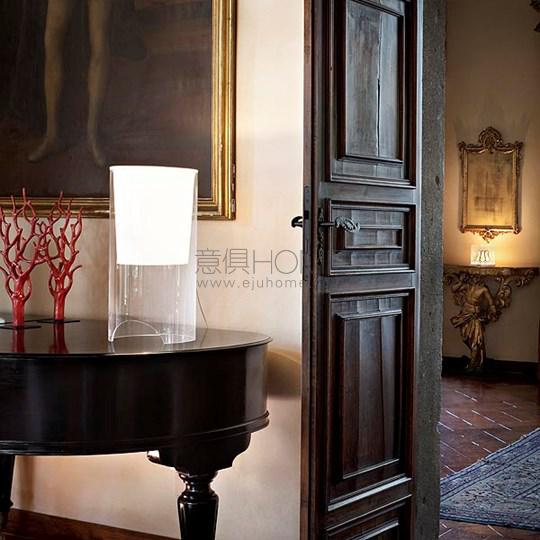 Table lamp providing diffused light. Clear glass cylindrical lamp body. White opaline glass diffuser and reflector.