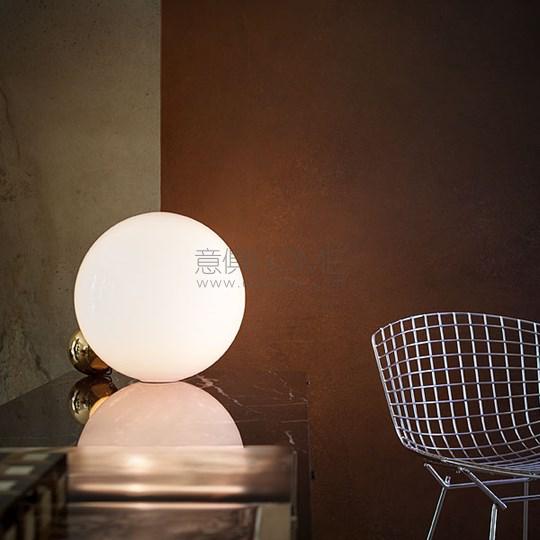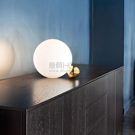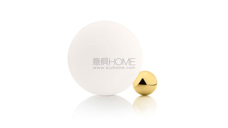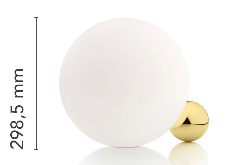 Table lighting fixture comprising an aluminium sphere machined from solid and then gold-coated with 24 K gold. Blown glass opal diffuser. LED light source with dimmer switch on the power cable.