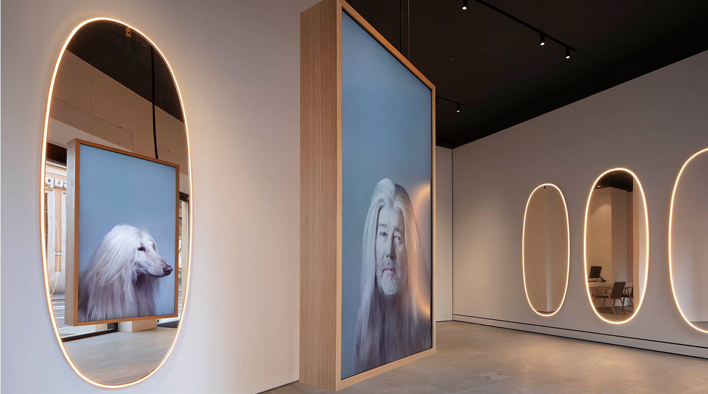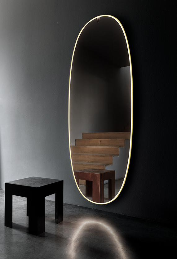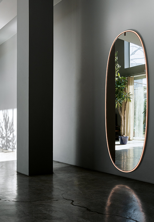 Plus Belle is a mirror with incorporated light sources. The aluminium frame is available in various finishes (polished gold, polished copper, polished bronze and brill fumé, and houses high chromatic rendering led light sources (CRI 95) and an optical opal silicone diffuser. The mirror is made of 6 mm extra-clear glass, with a layer of safety and aesthetic film to the rear, and it is fixed to the frame by means of a polycarbonate glazing bead. The Plus Belle mirror is hung from the wall by means of an aesthetic effect hook with a dual magnet fixing device to keep it in position. It is powered by means of a wall-mounted power supply unit or IEC cable and connector socket. The optic sensor command fitted to the mirror or remote 0-10/1-10 V - PUSH - DALI control can be used as a dimmer to adjust the light intensity by 10% to 100% in either direction.