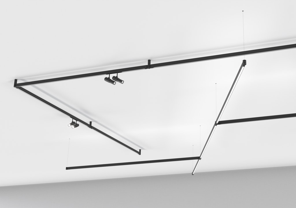 Innovative profile system for surface and suspended installation characterized by an extreme flexibility. Profiles are equipped with integrated lighting available in direct and indirect emission with the possibility of adding two spots in order to combine accent lighting.