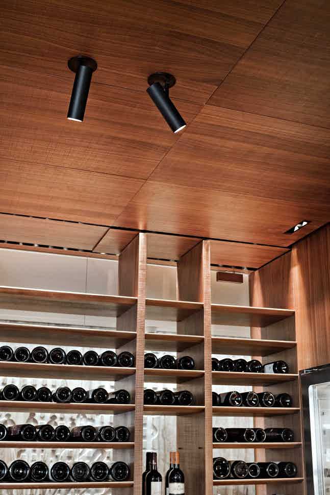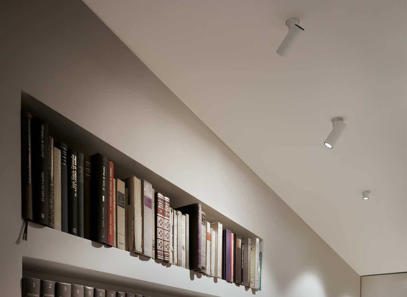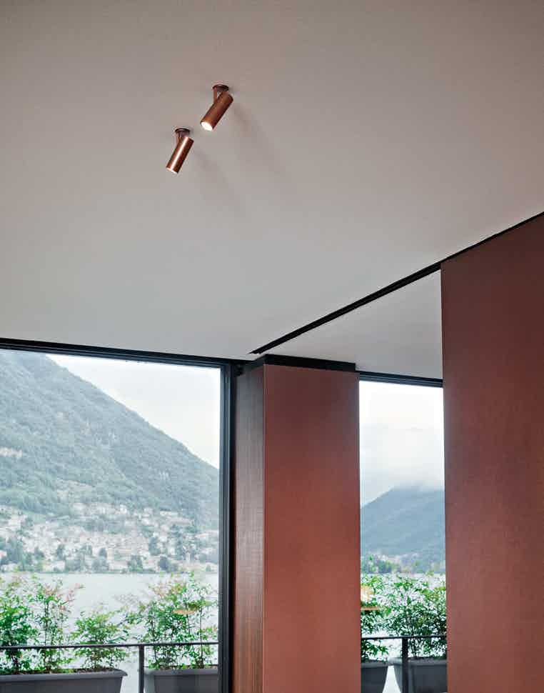 Interior lighting spotlight with LED light source. Available in three versions: Mono Point version, consisting of a removable cylindrical housing which, in its upper position, acts as a downlight, and in its lower position, becomes a directional spotlight, Double Point version, consisting of a recessed box which houses two spotlights and a Suspension version.