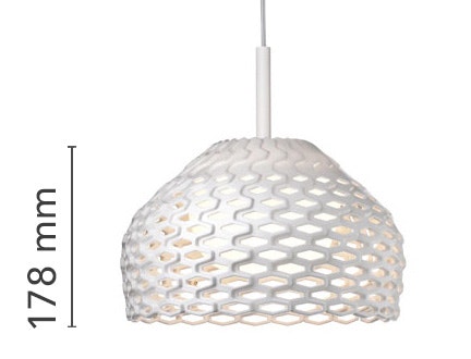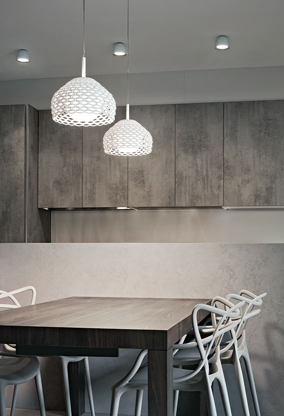 Diffused light suspended lamp. External diffuser in Polycarbonate. Internal diffuser in injection printed opal polycarbonate.