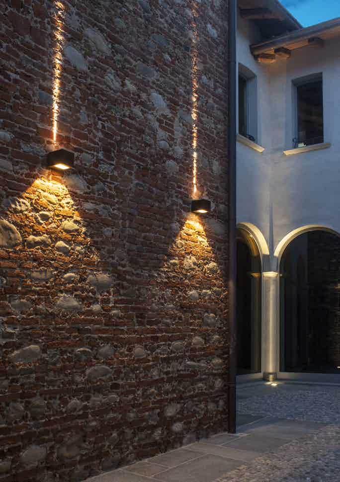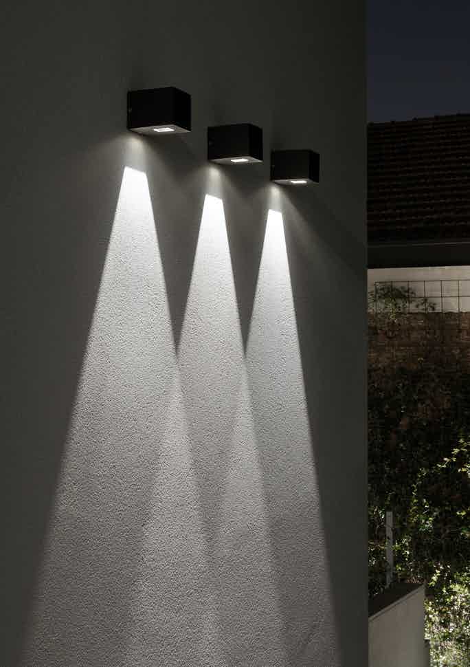 Square luminaire for wall installation, for creating light effects.Transparent glass diffuser or with convex lenses with silkscreen border.