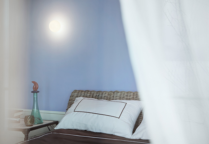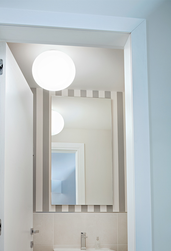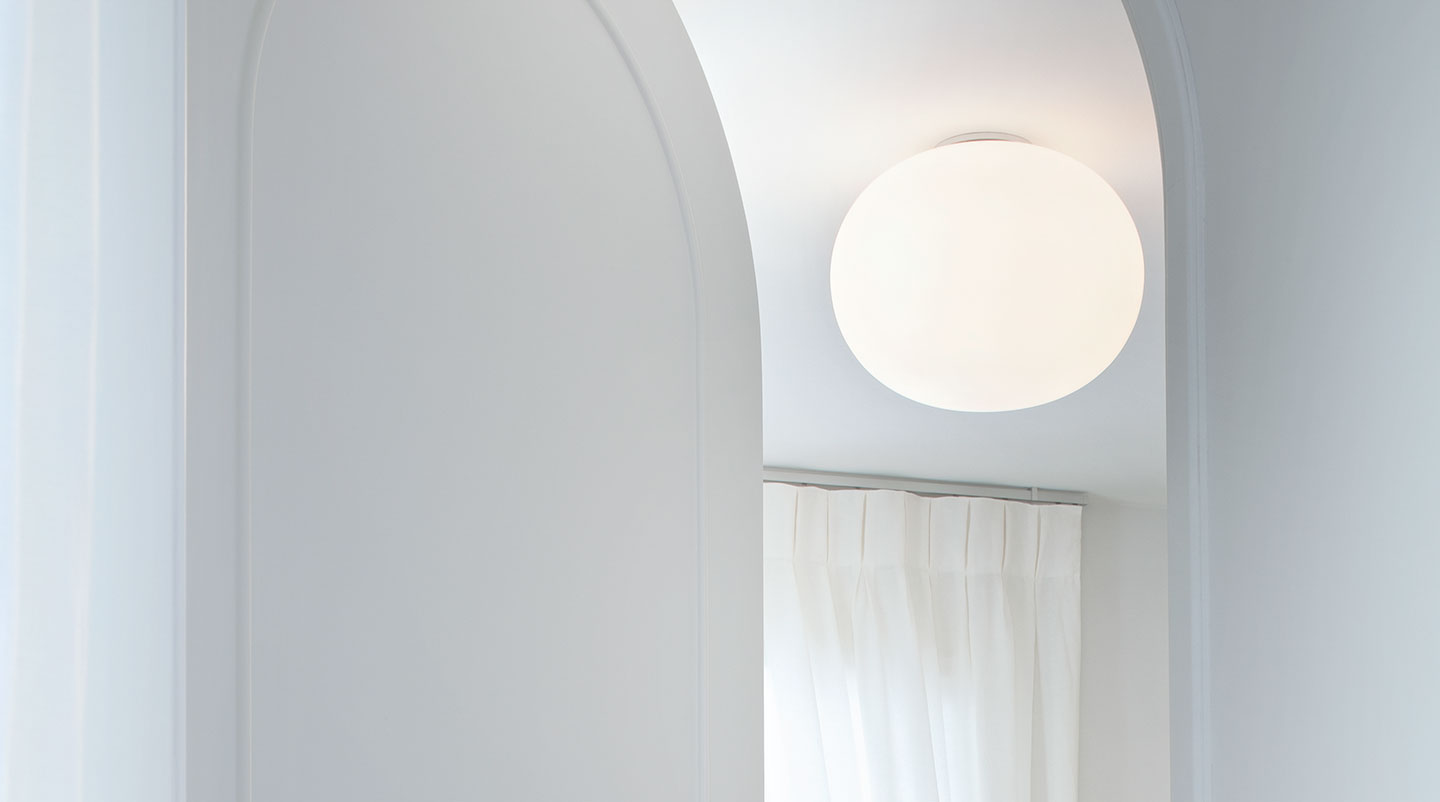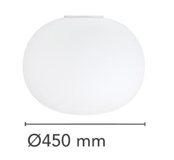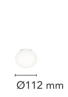 Ceiling mounted lamp providing diffused light. Diffuser consisting of an externally acidetched, hand blown, flashed opaline glass and of a die-cast aluminum threaded ring nut with alodine plating finish. 30% fiberglass reinforced injection-molded polyamide ceiling fitting; gray painted die-cast aluminum diffuser support.